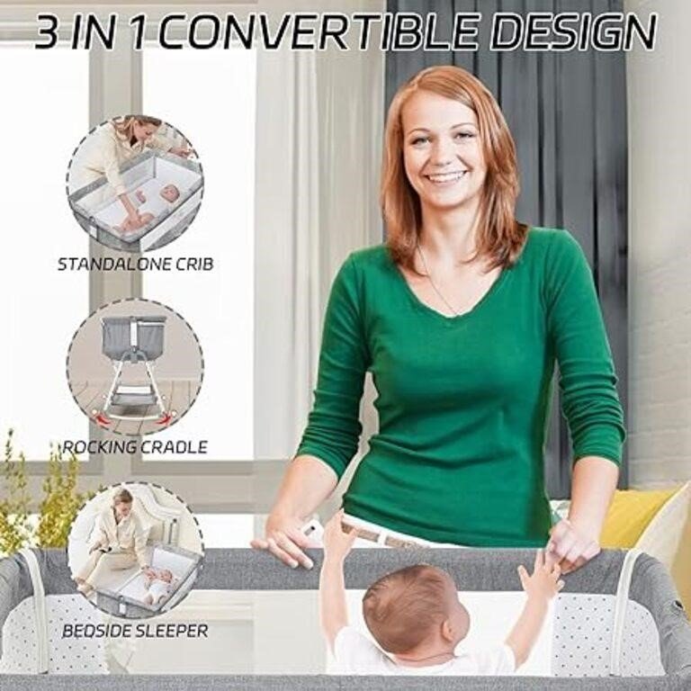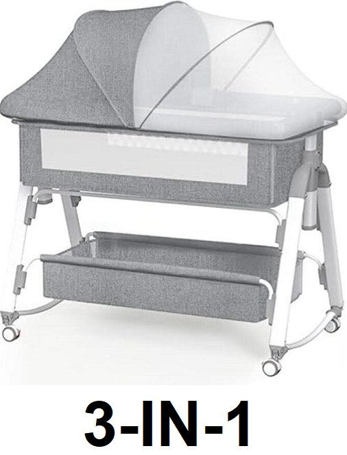 tukiie 3-in-1 portable bedside baby bassinet with wheels - 36" x 22" x 35" - grey