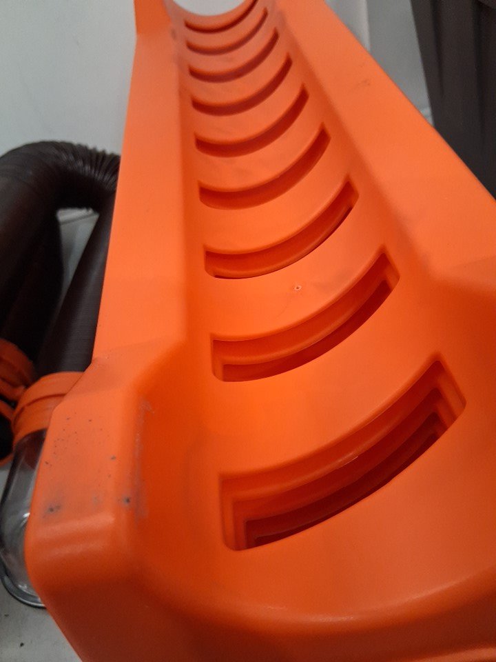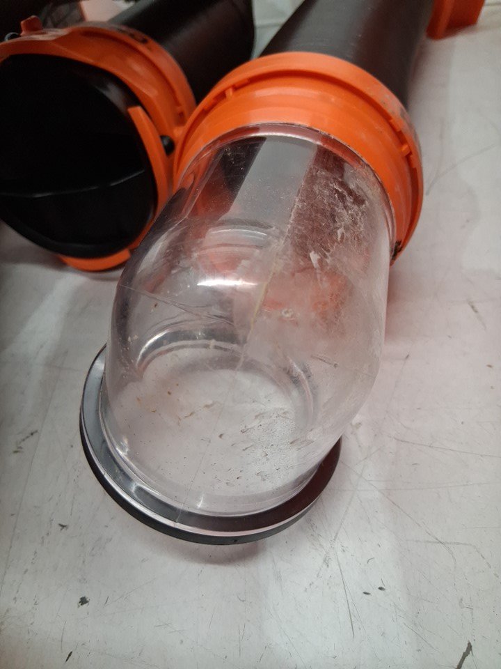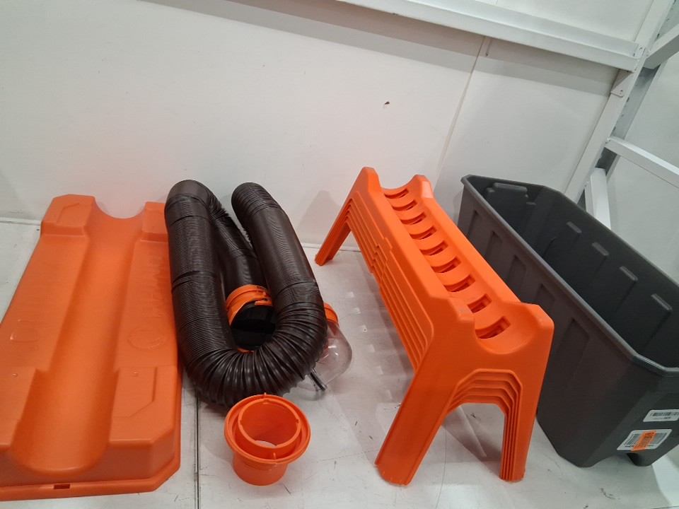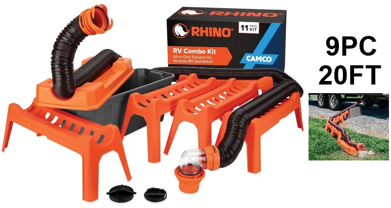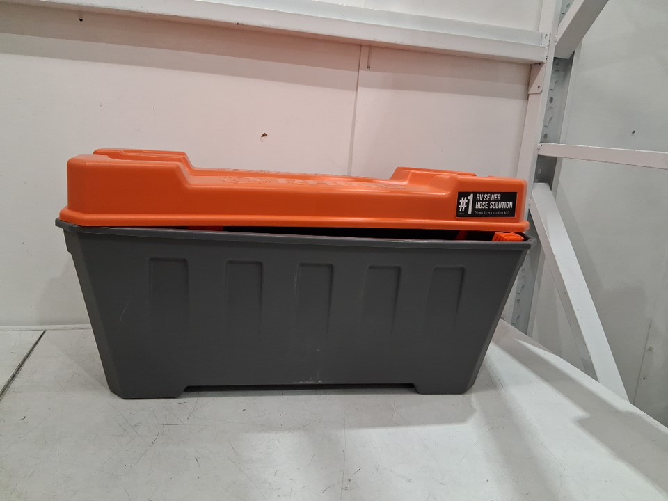 The hose has a few dents, and some of the sewer hose supports have smudged stains along with the clear elbow from previous use. The item is also missing the two storage caps, as shown in the photos.