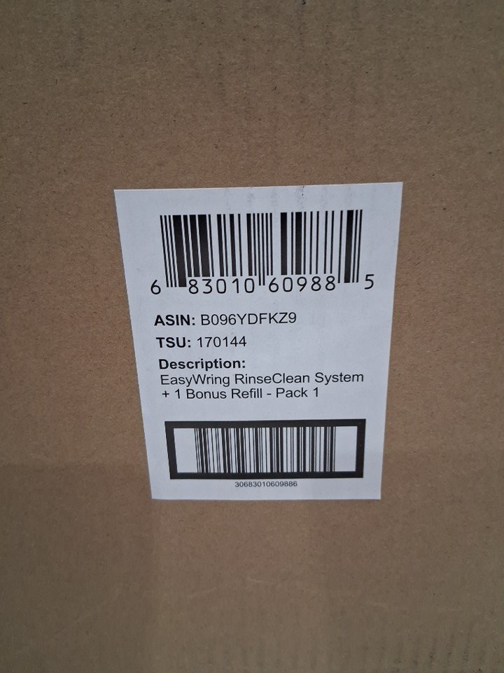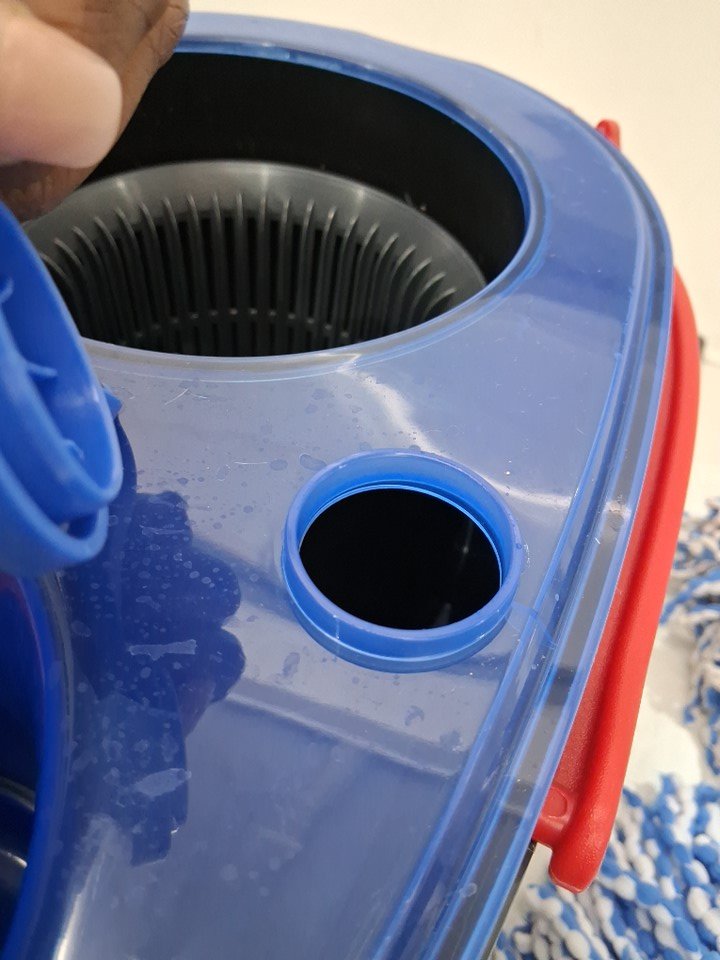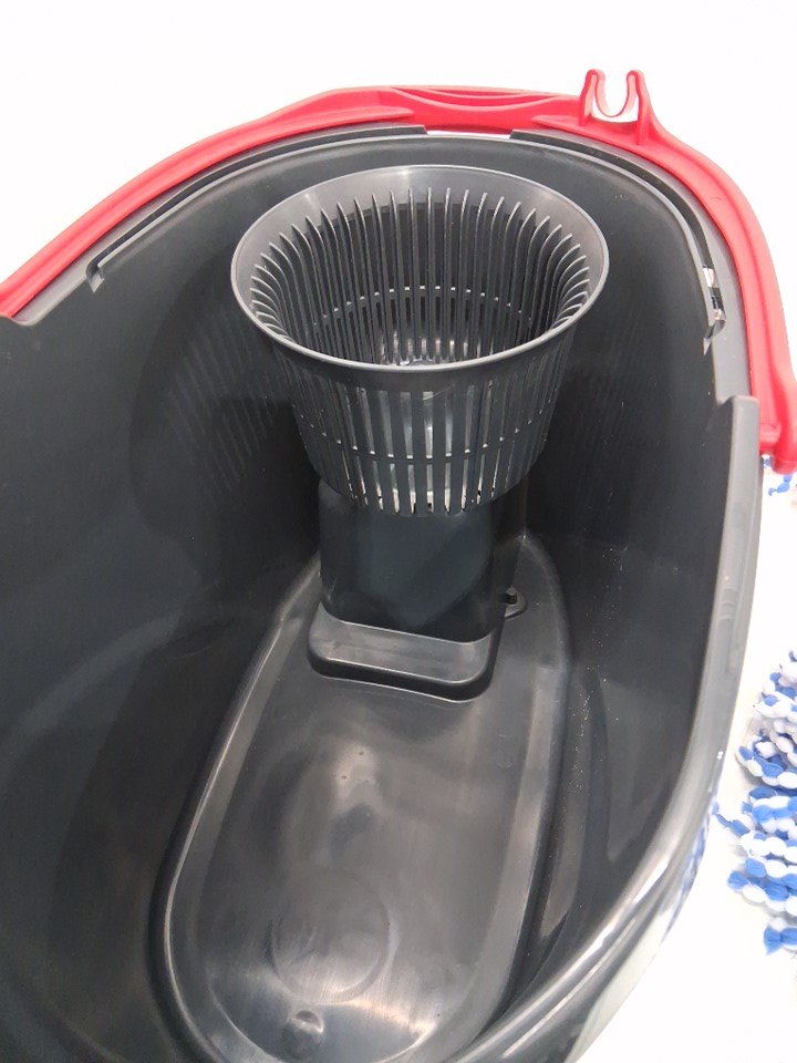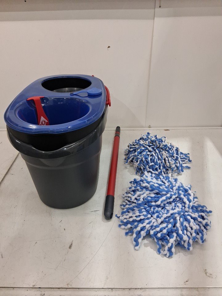 One of the mop heads appears dirty, and the bucket has water marks from previous use, as shown in the photos.