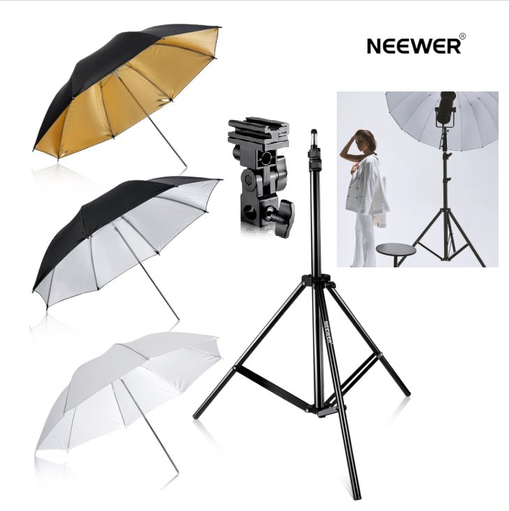 NEEWER 3 umbrellas flash mount kit- soft white/silver reflective/gold reflective - black