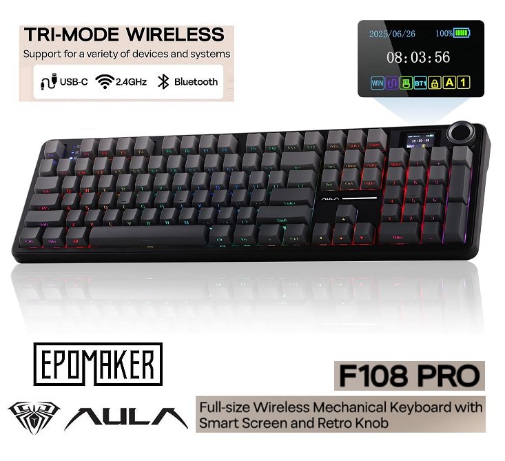 EPOMAKER X Aula F108 PRO Wireless RGB Backlight Gaming Keyboard with BUILT-IN Screen & Battery - TRI-MODE USB-C, WIRELESS 2.4GHZ, & BLUETOOTH - BLACK GRADIENT - (MODEL: F108-PRO)