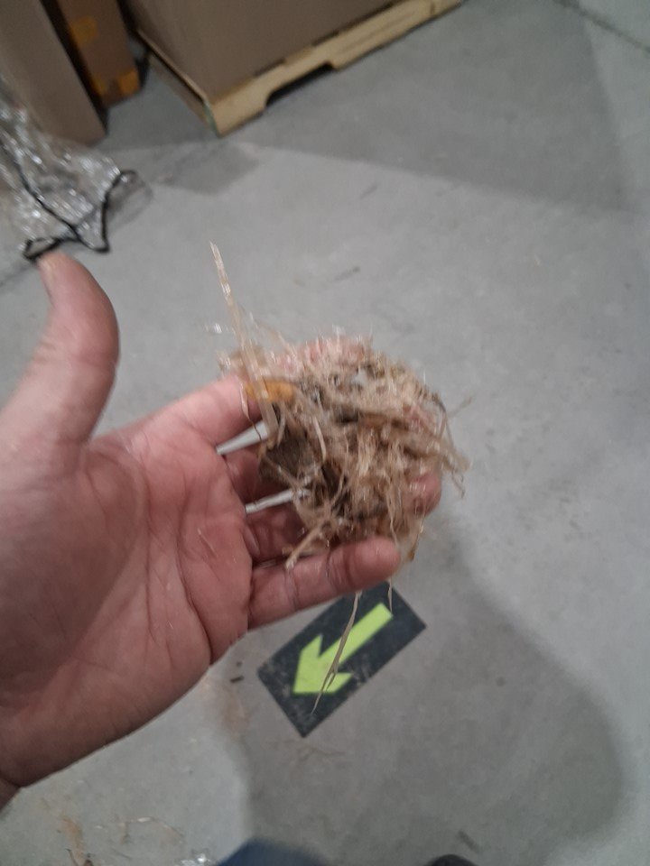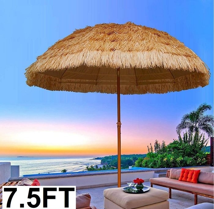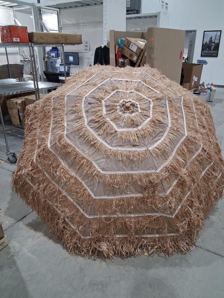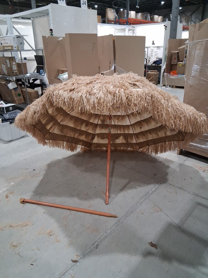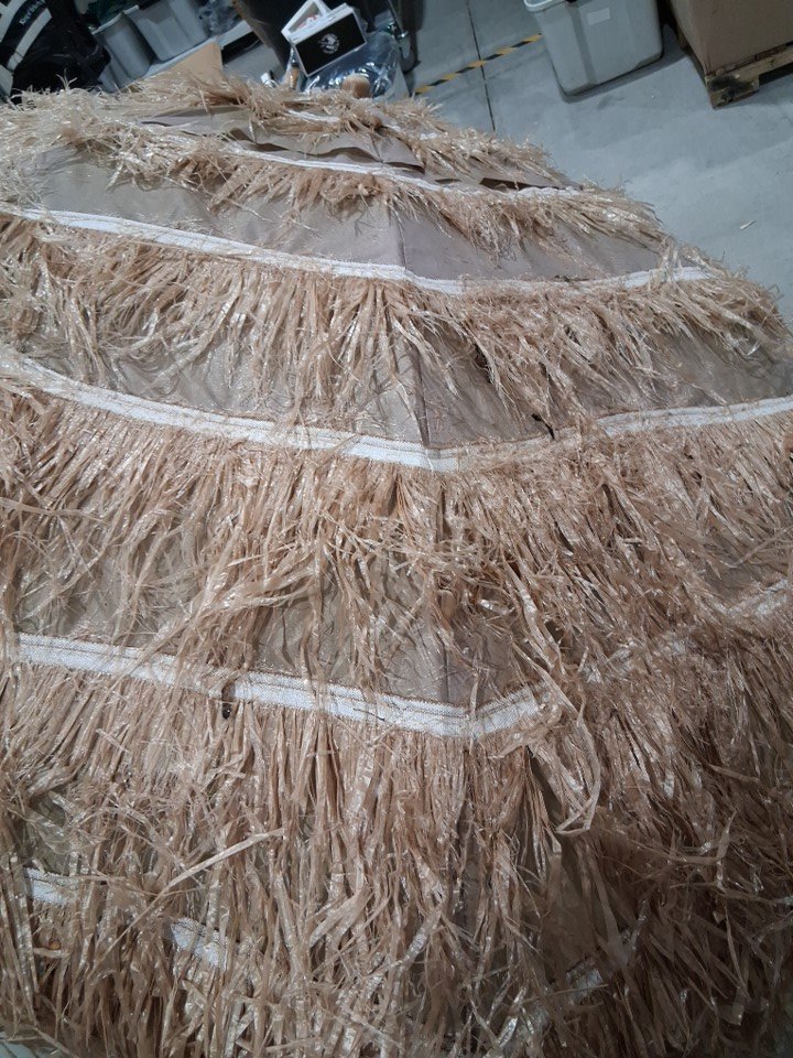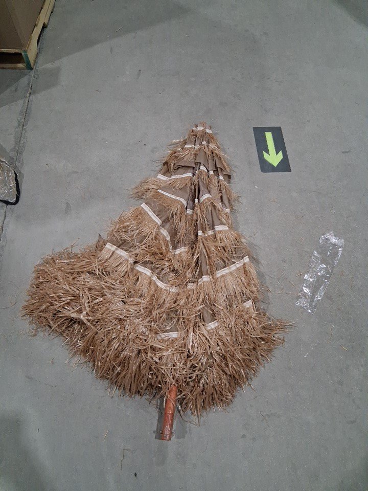 Alot of debris such as stick, bugs and some mud on top of the umbrella also upon inspection it was noted that the fake straw on the umbrella is very easily removed and also the umbrella has a noticeable odor of dirt.