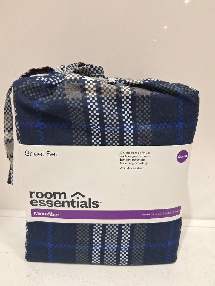 4PC Room Essentials Microfiber Sheet Set - Queen - Blue/Gen Plaid