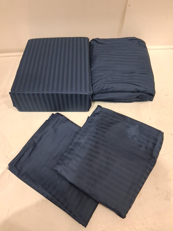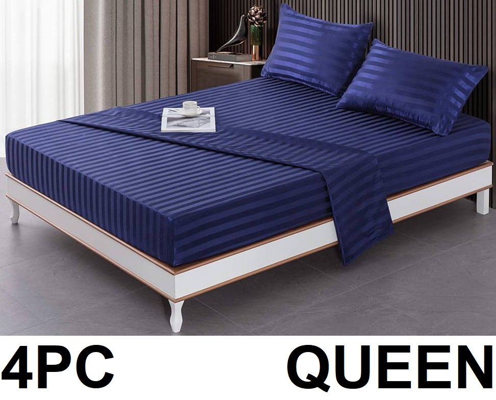4PC SATIN STRIPES BEDDING BED SHEET SET - QUEEN - NAVY BLUE