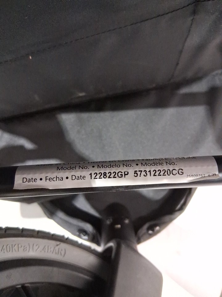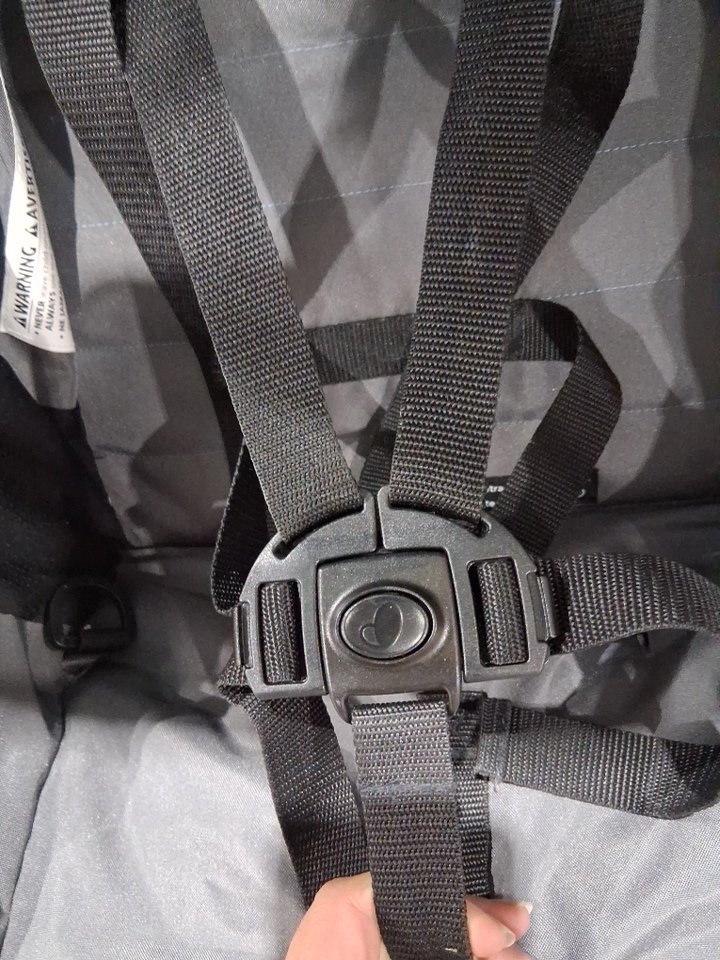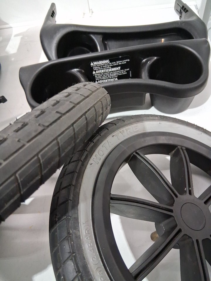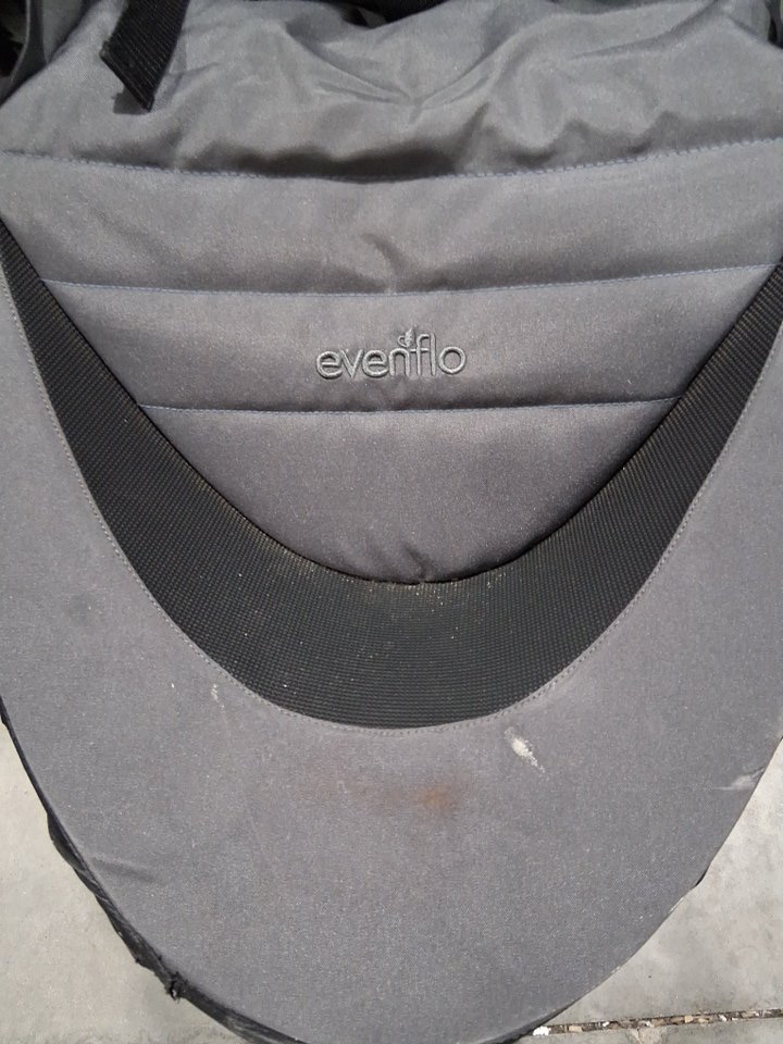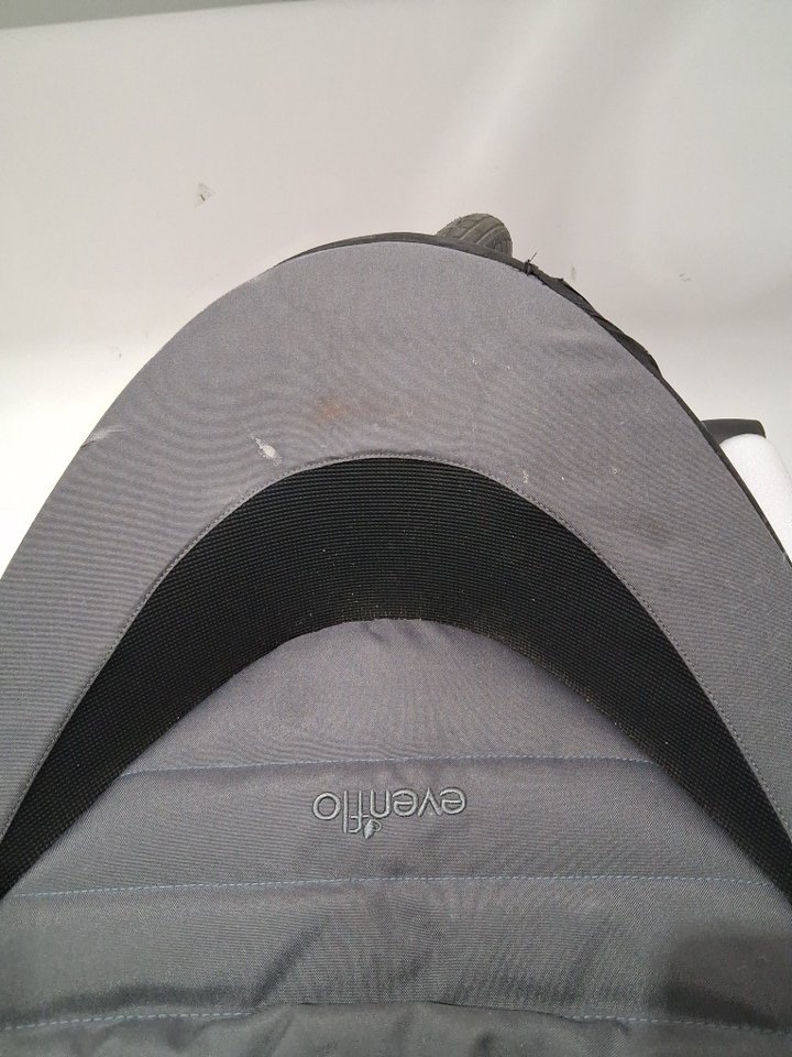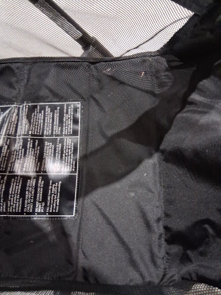 It has dirt, stains and scratches, and the plastic where the wheels should be inserted is cracked. harness pad is missing—see photos.