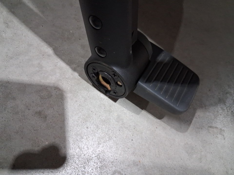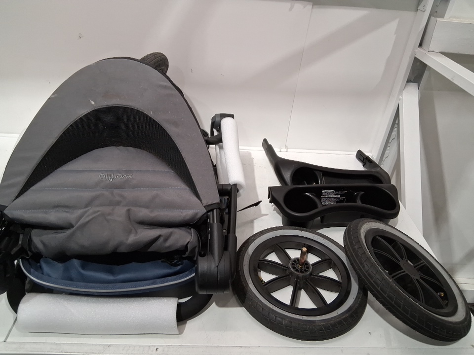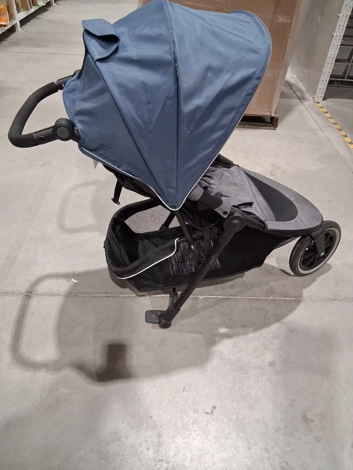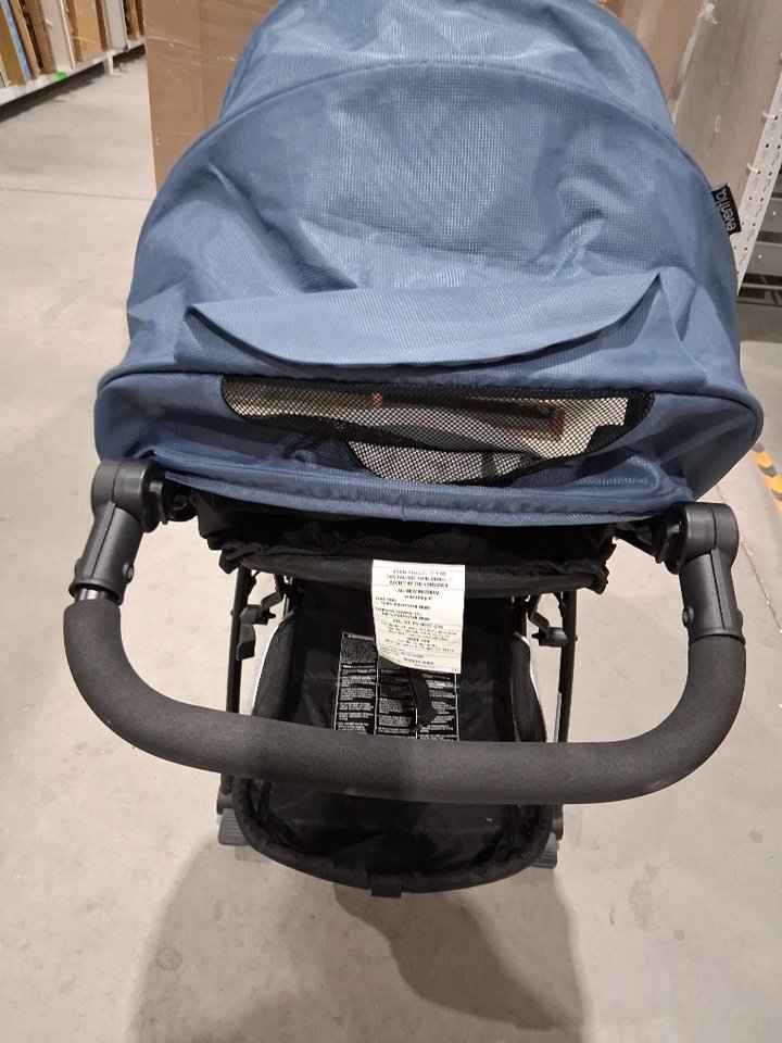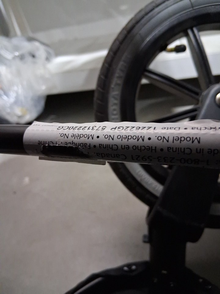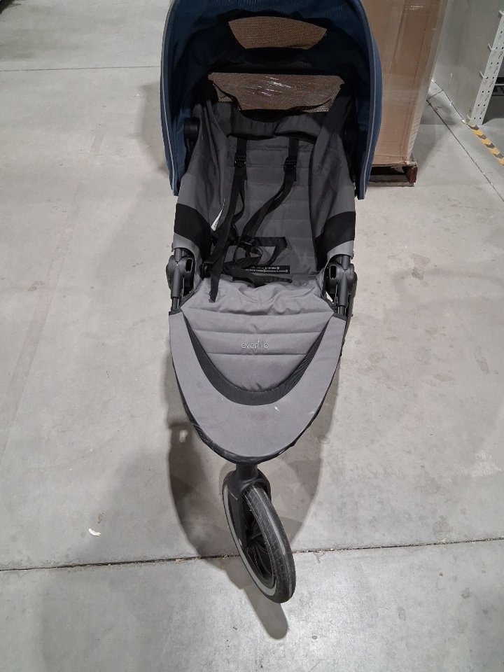 It has dirt, stains and scratches, and the plastic where the wheels should be inserted is cracked. harness pad is missing—see photos.