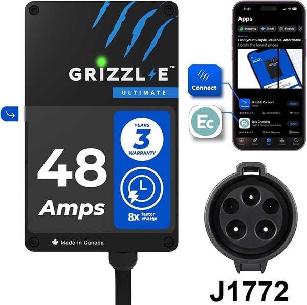 Grizzl-E 48A Ultimate 48A Electric Vehicle EV Charger - 8X CHARGE - J1772 Connector - Classic Black (Model: ‎GRU-077-W-HW-25IJ48-A-GB)