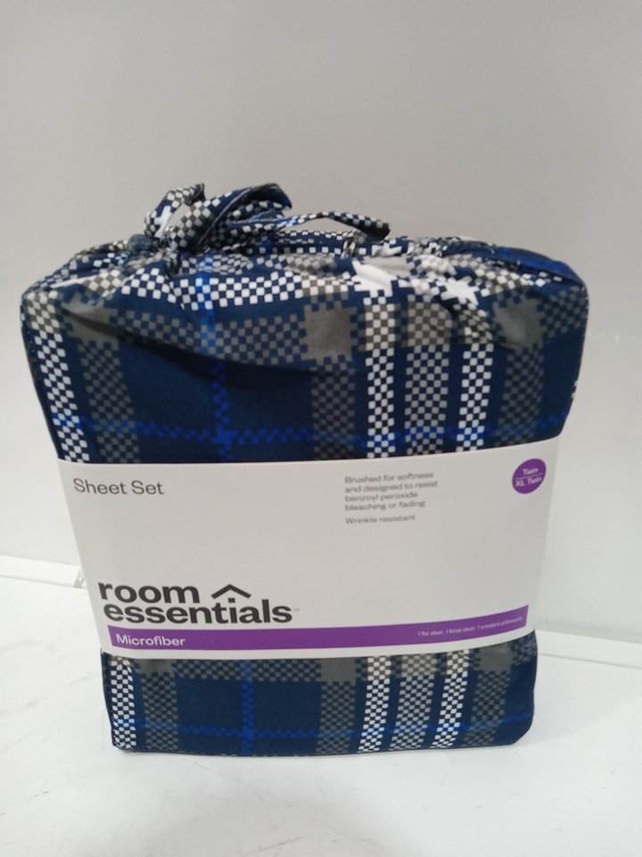 3PC room essentials microfiber sheet set - TWIN/EXTRA LARGE TWIN - blue plaid