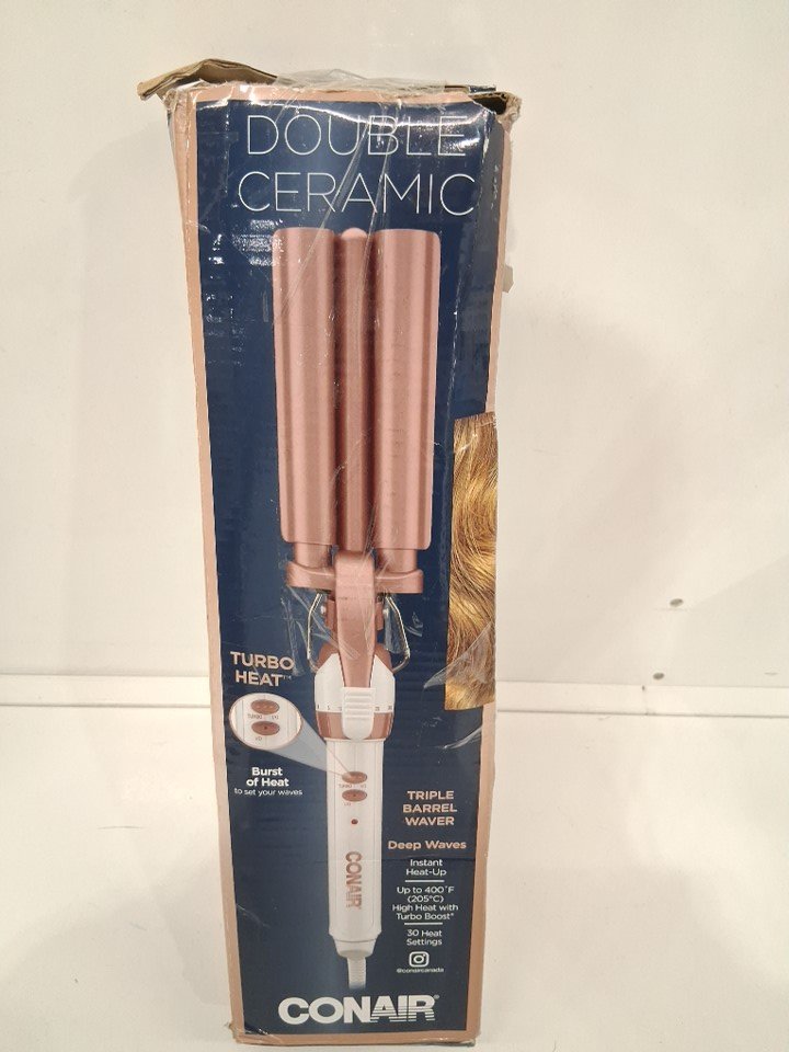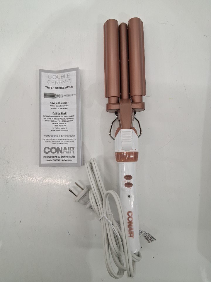 CONAIR DOUBLE CERAMIC TRIPLE BARREL CURL STYLING WAVER FOR DEEP WAVES - 3/4" BARRELS - WHITE/ROSE GOLD (MODEL: CD704C)
