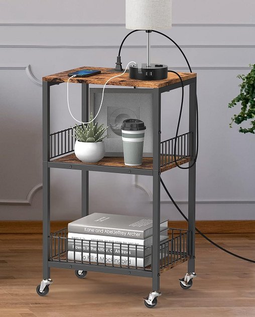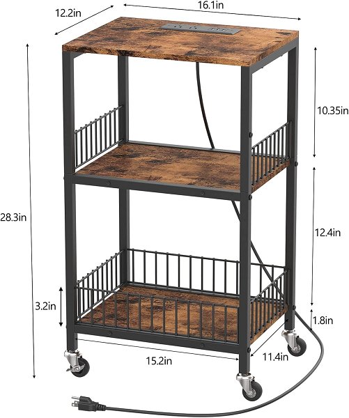 NORCEESAN 3-tier end table with charging station usb ports & outlets - 28.3" x 12.2" 16.1" - rustic brown (model: ‎R02-NX-R823-B1)