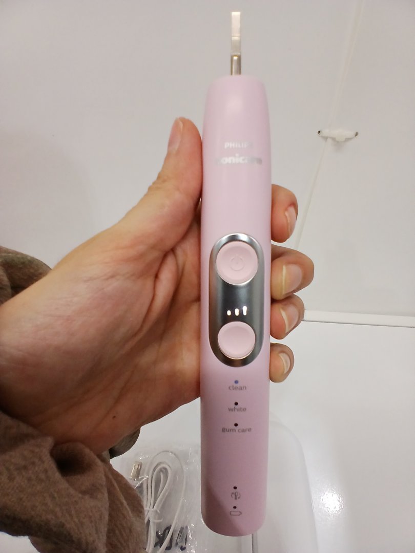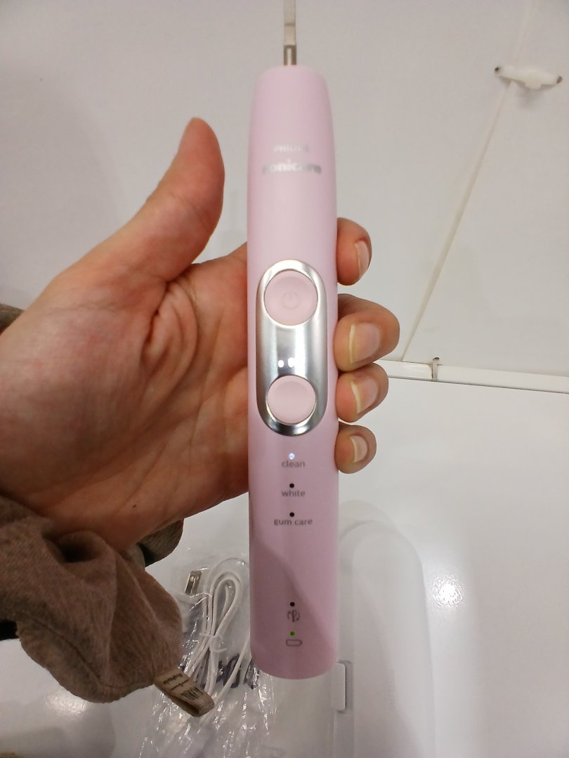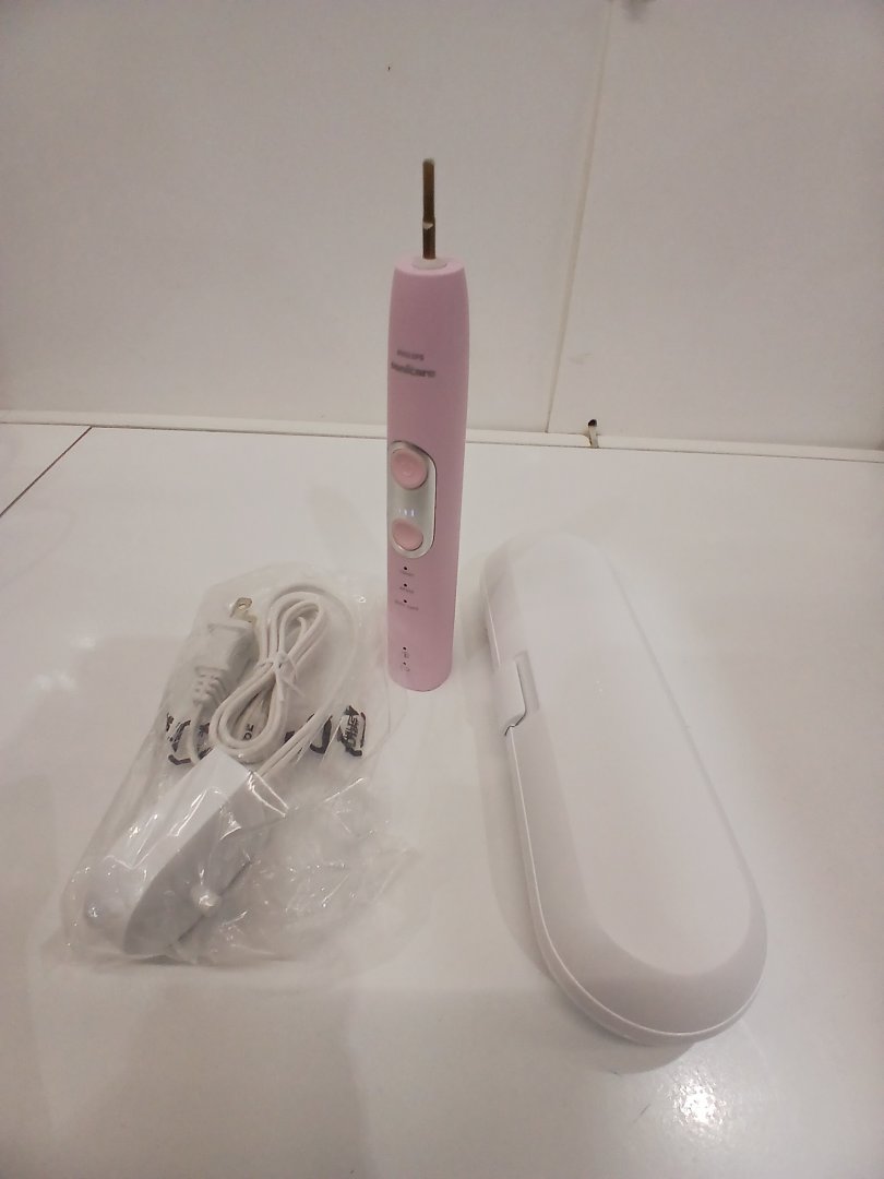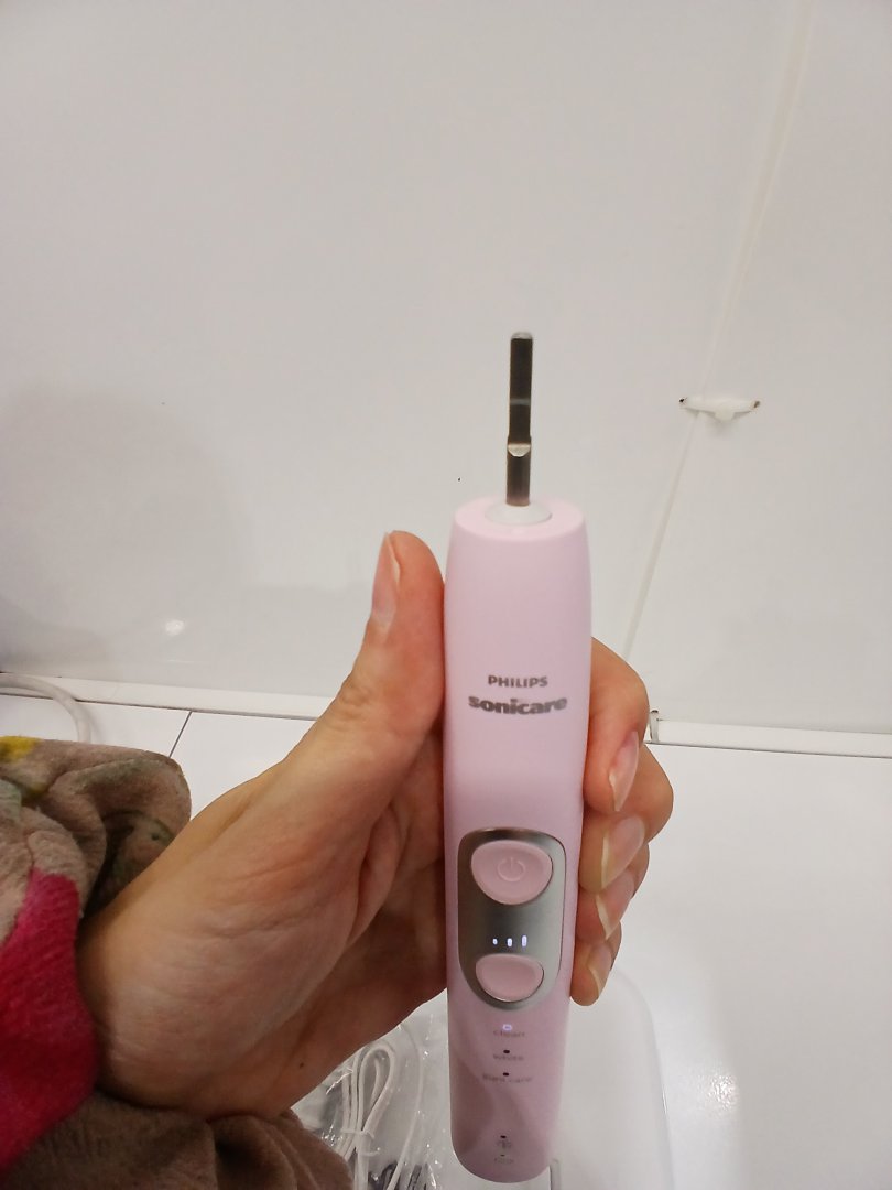 There is some toothpaste residue on the brush handle, and the brush heads need to be replaced