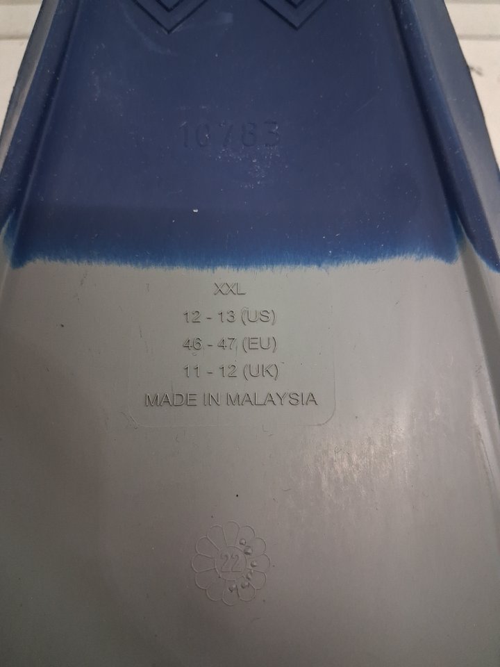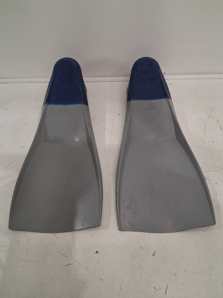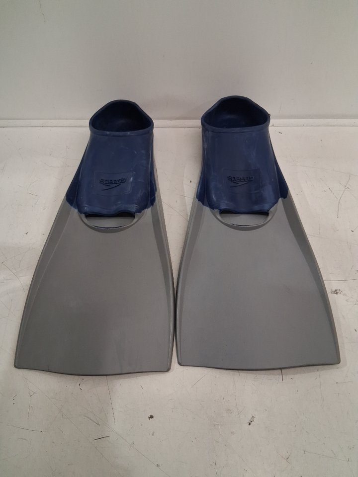 Please note: • The flippers show signs of previous use with scuff marks along the blue, see photos. • A size chart can be found at https://ca.speedo.com/trialon-rubber-swim-fin-black/13236384.html
