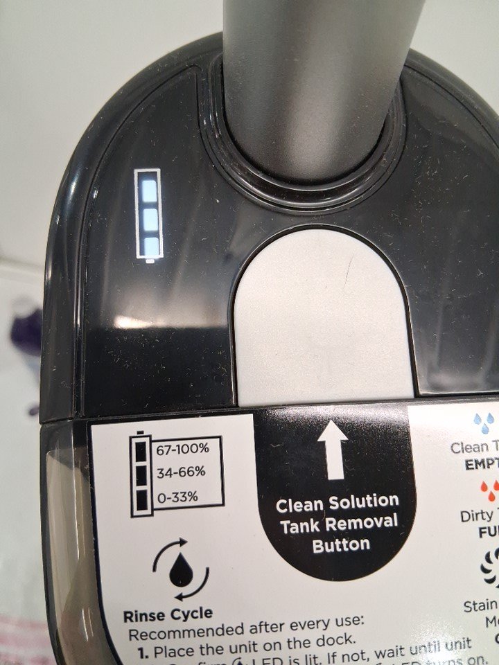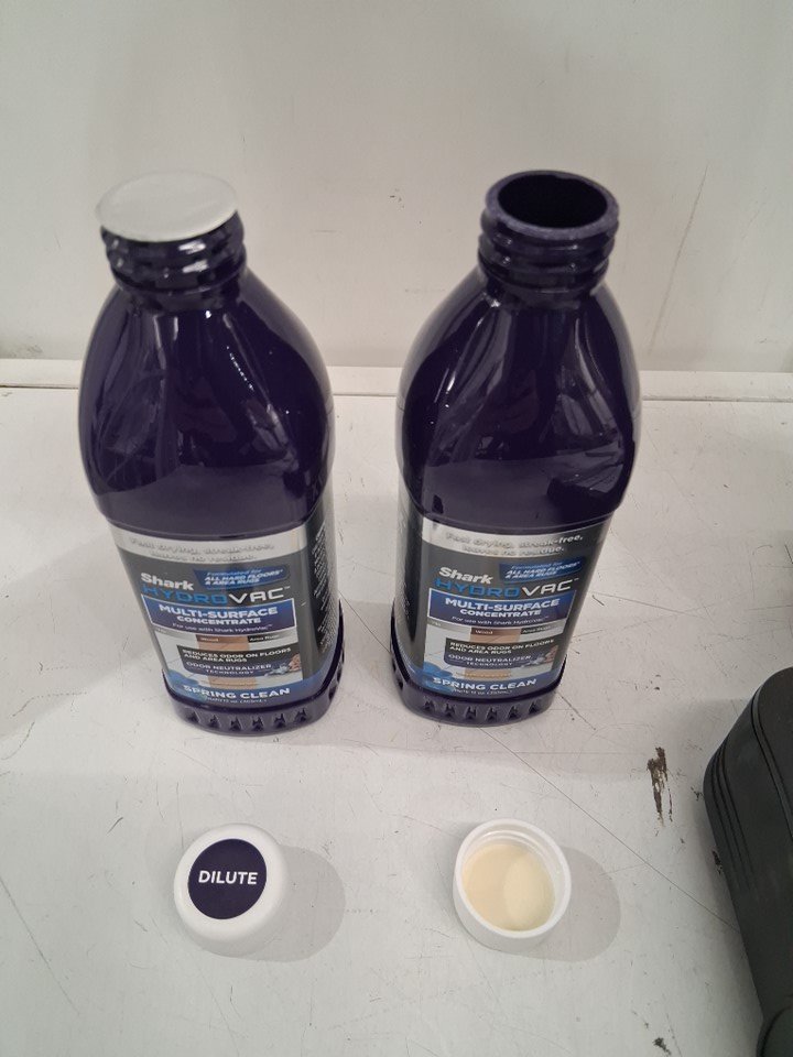 One bottle of cleaning solution opened indicating vacuum has prior short-term use. (See photos)