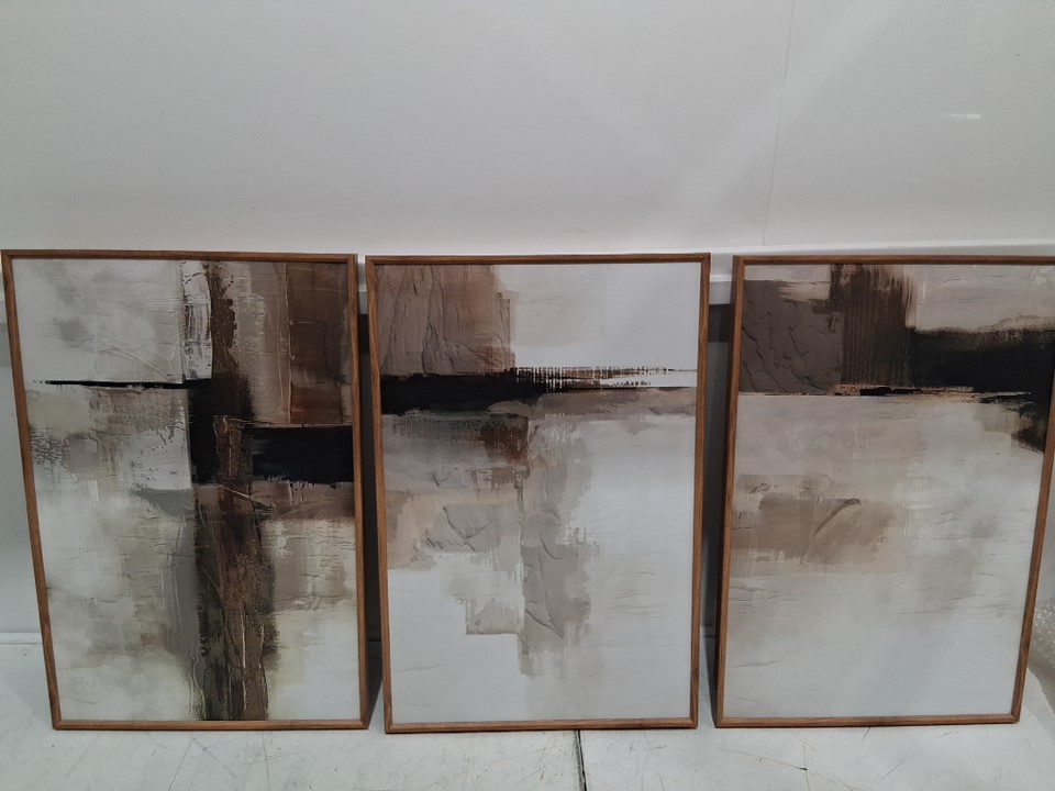 3pc houria large abstract minimalist brush stroke neutral art print with wood frame - 16"x24" - brown/white/beige