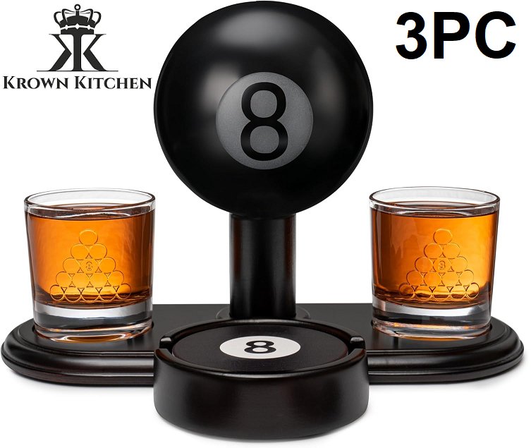 3PC Krown Kitchen 8 ball whiskey decanter set with 2 glasses - 13.7" - black