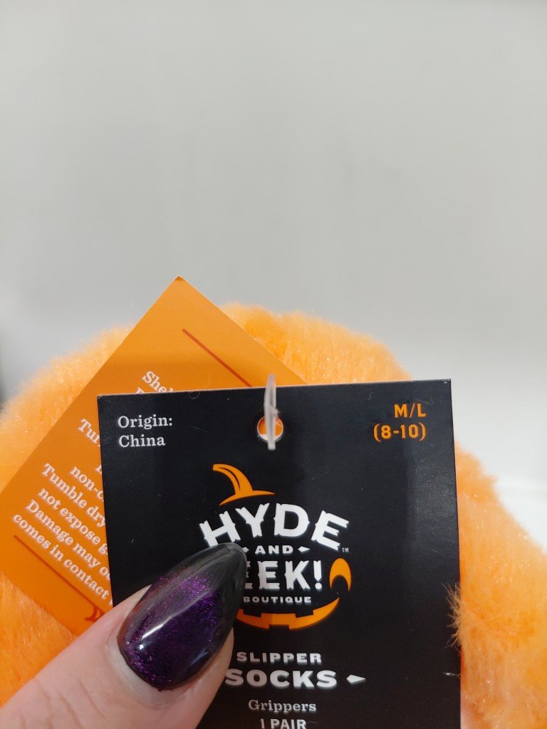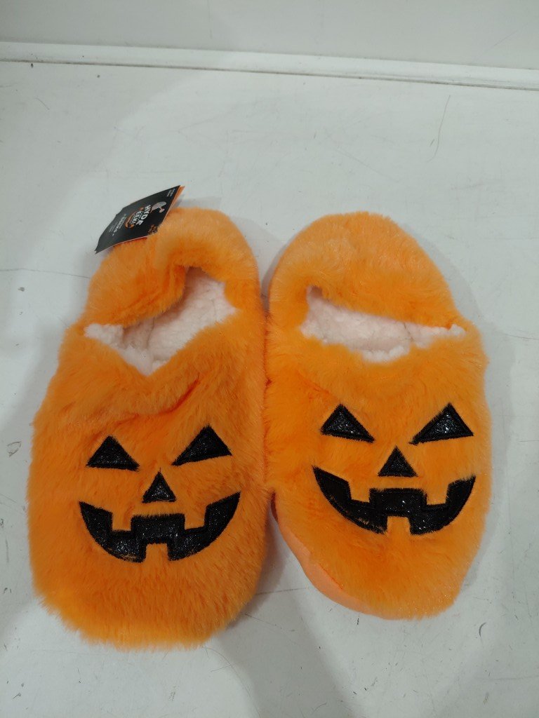 Women's Hyde and EEK! Pumpkin Embroidered Halloween Faux Fur Slipper Socks with Grippers - Size 8-10 - Orange/Black