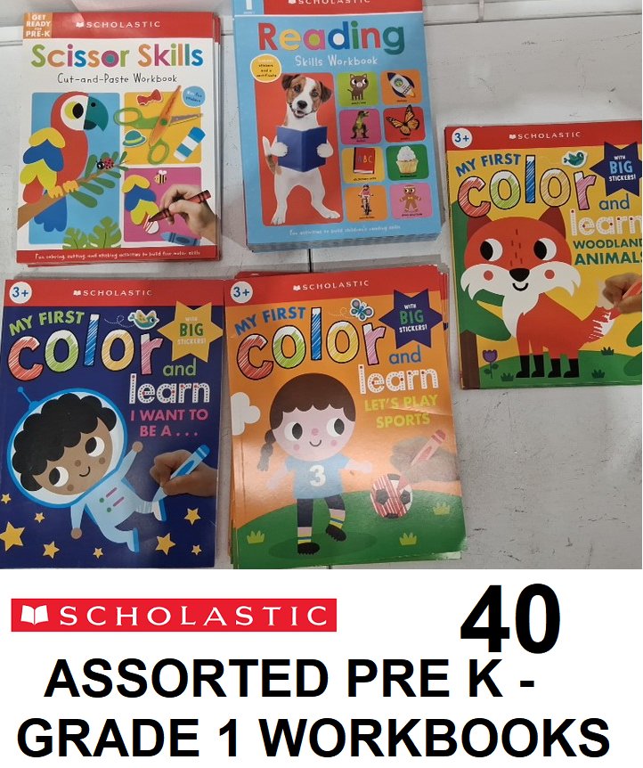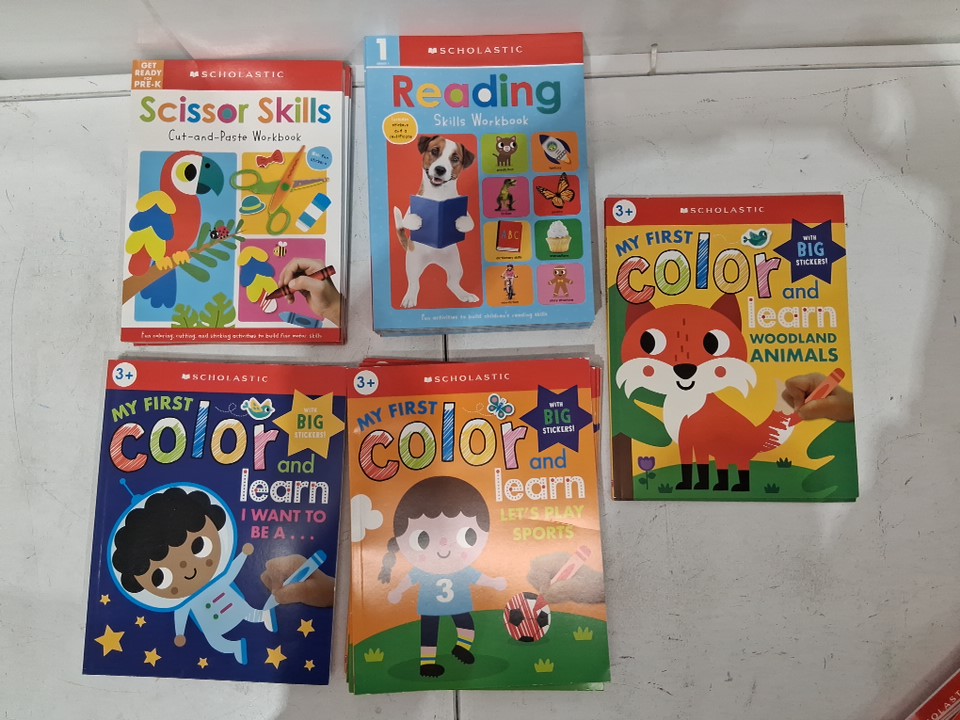40 ASSORTED SCHOLASTIC pre k to grade one work books - scissor skills, reading skills, colour and learn