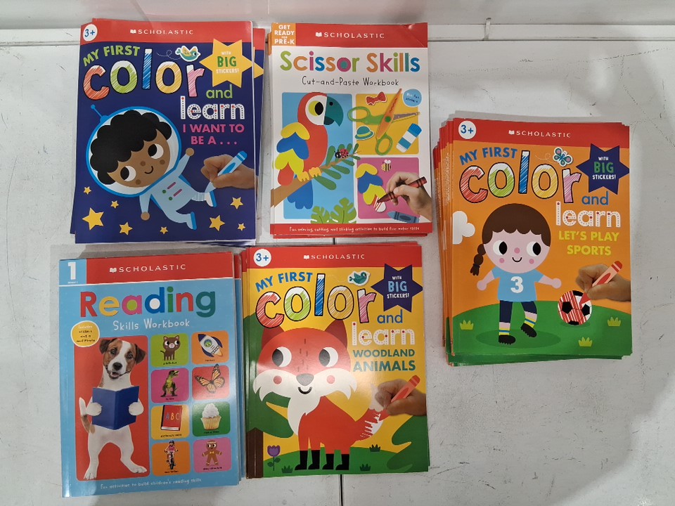 47 ASSORTED SCHOLASTIC pre k to grade one work books - scissor skills, reading skills, colour and learn