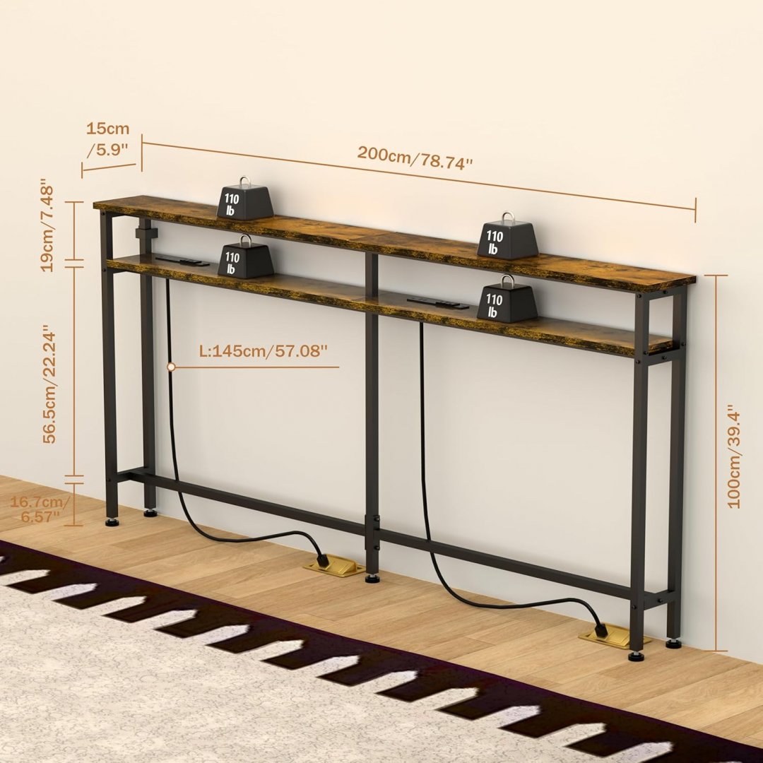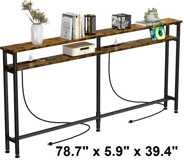 keelian Double-Layer Narrow Sofa Table with 2 Power Outlets - 78.7" x 5.9" x 39.4" - rustic brown (model: DLST-01)