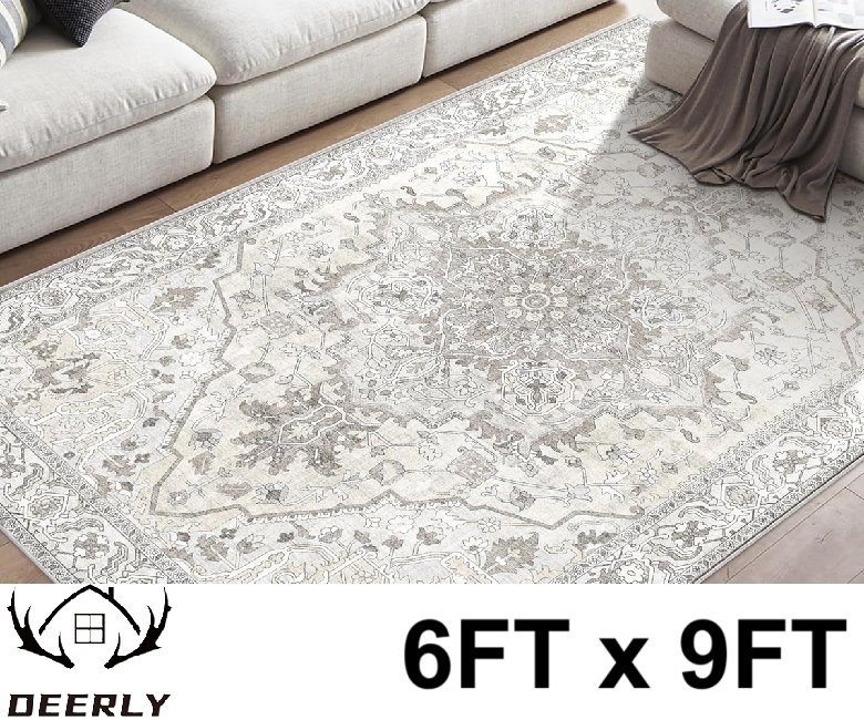 Deerly Non-Slip Soft Low-Pile Washable Boho Area Large Rug - 6FT x 9FT - Beige (Model: ‎BK02-015)