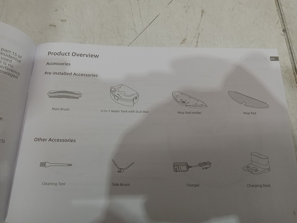 There are minor dirt residue on the mop pad and on the side brush due to previous use. Tested for power, suction, movement, App connectivity. (Please see photos)