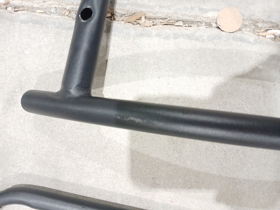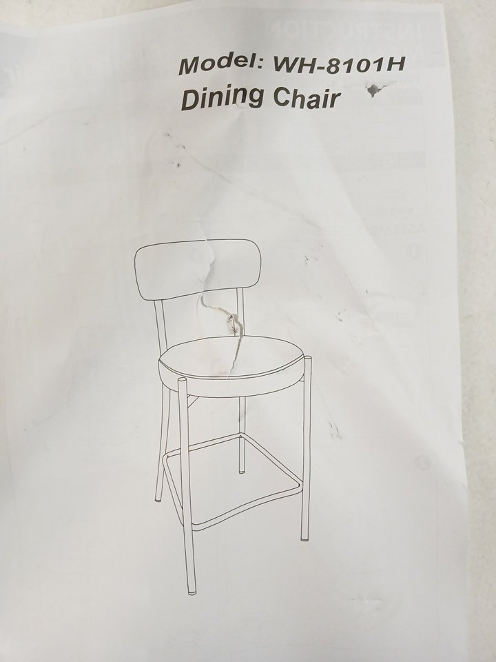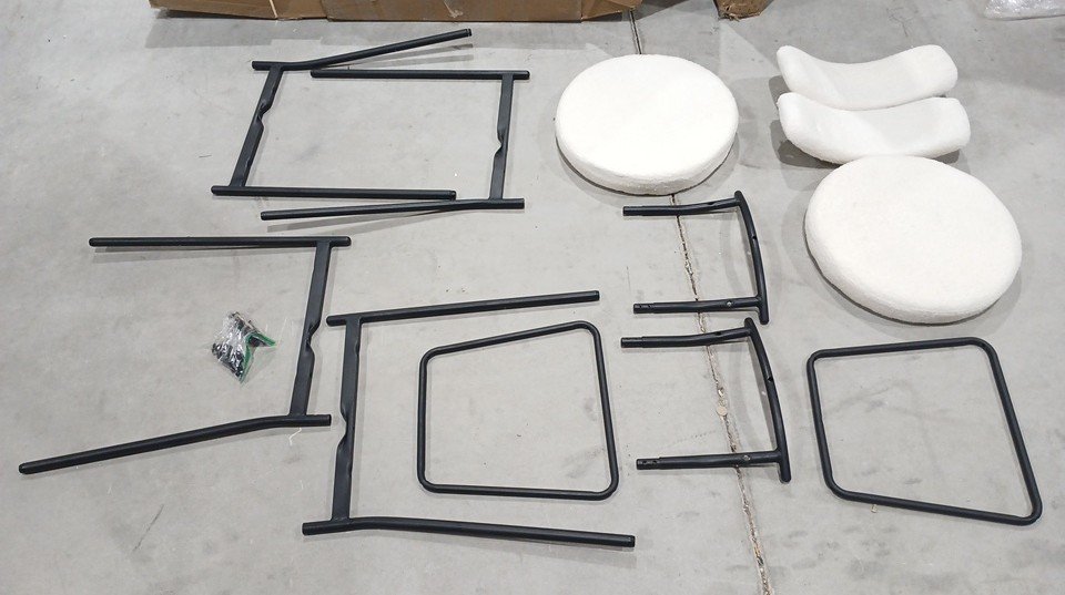 This item has previous assembly marks. The black metal frame foot rest has what appears to be a dent (see final image) but because it is uniform on all sides for both chairs that is likely by design and not a defect. Additional hardware may be required for assembly