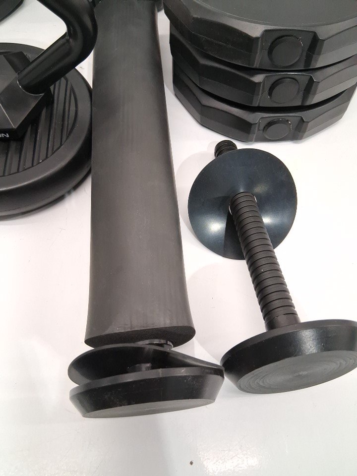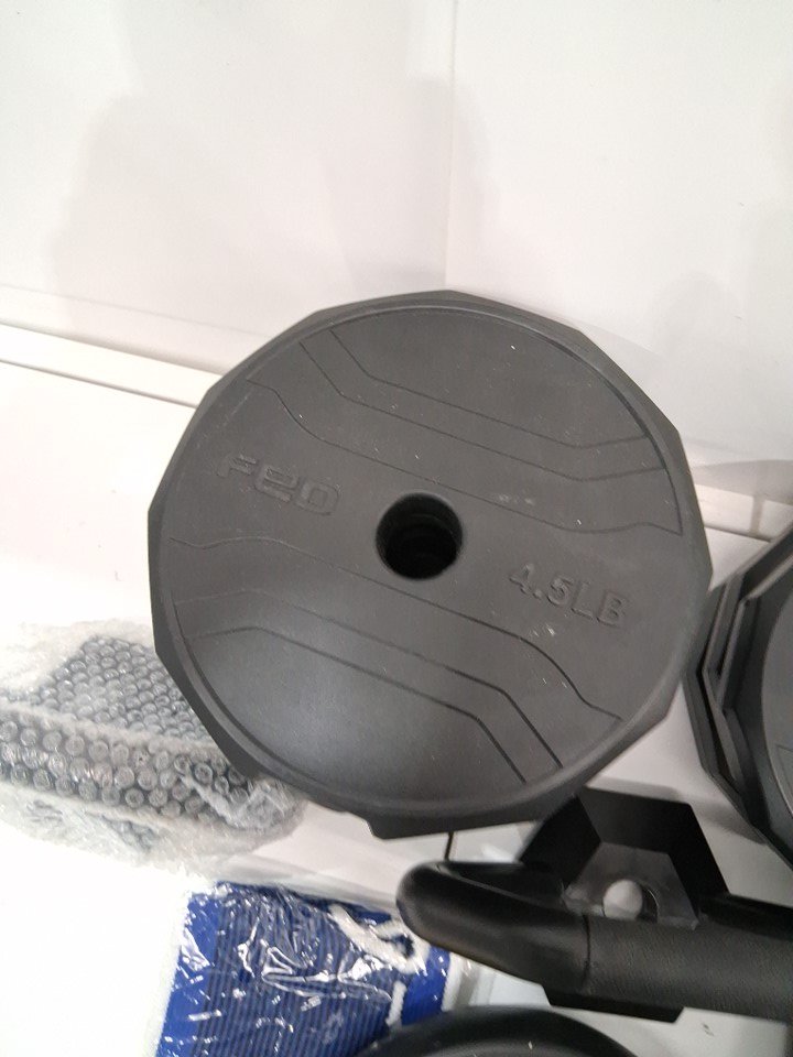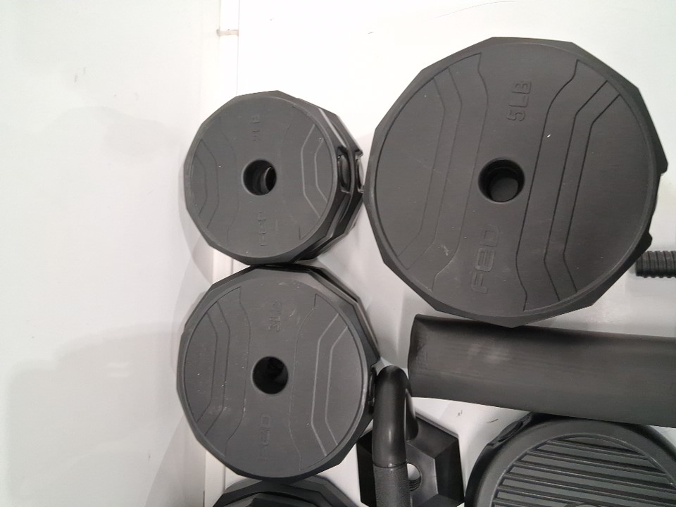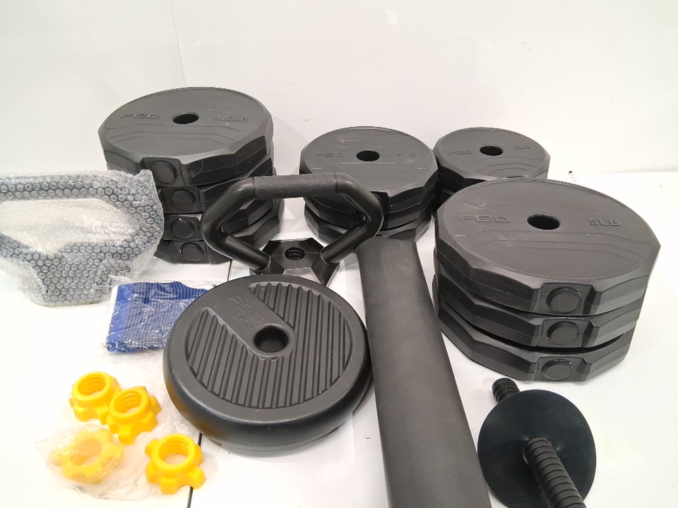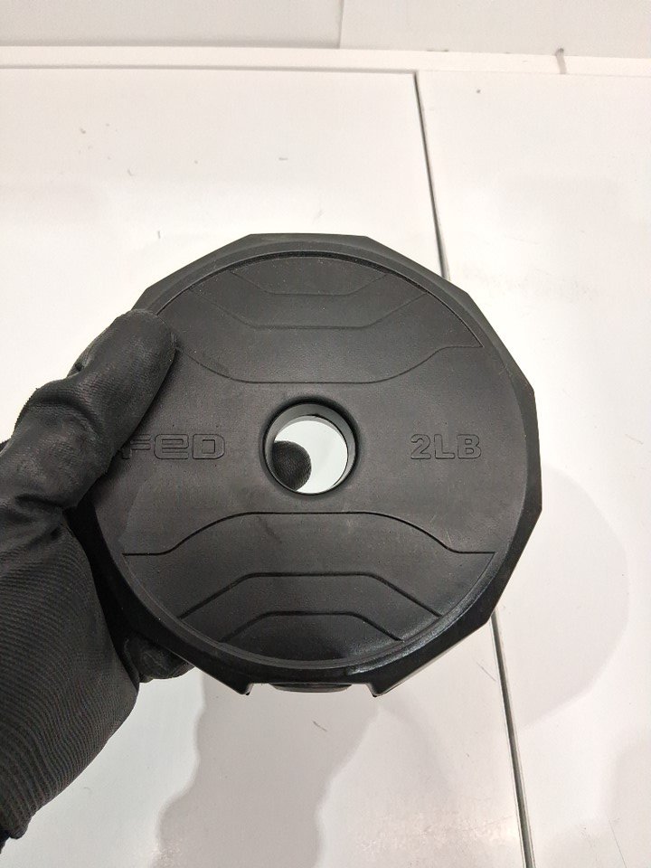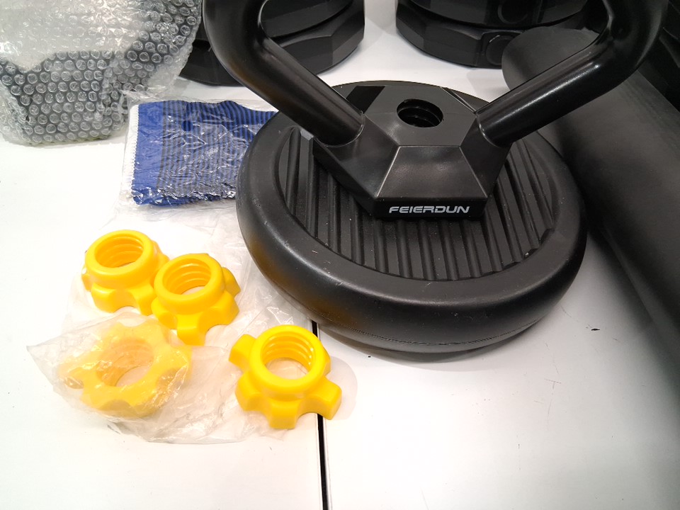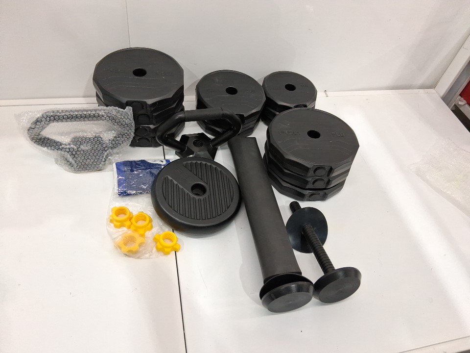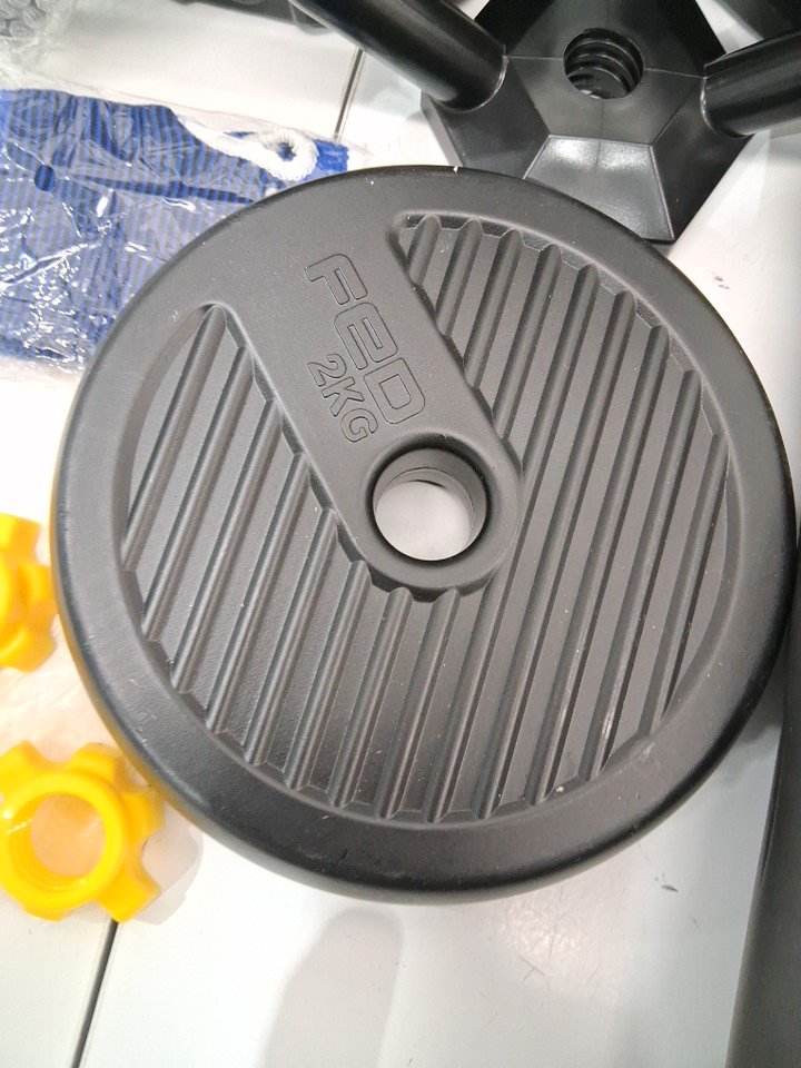 There are weights from different sets and one round one from another dumbbell set of the same brand We have other parts such as a barbell center grip, theoretically, one could use the barbell poles with this and weights since the threading lines up, but as it is not the intended purpose we cannot guarantee this will not cause issues.