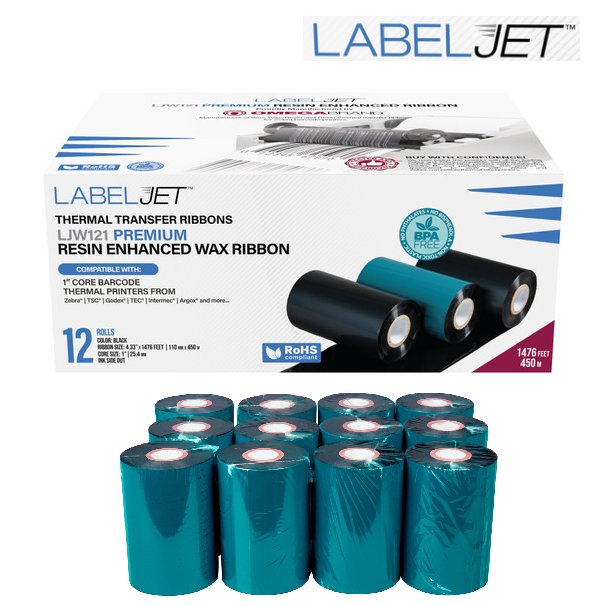 10pk omega brand labeljet LJW121 Wax Ribbon For Zebra Industrial Printers - 6.50" x 1467ft - black (model: lj00025)