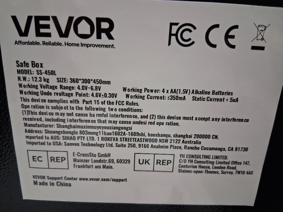 Vevor Depository Safe with Drop Slot and Code Lock - 1.7L - Black (Model: SS-450L)