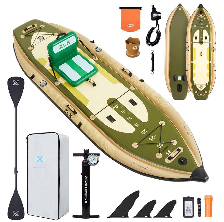 zlx inflatable fishing paddle board with dual reinforced sides - 11ft 6" x 42" - brown green (model: zlx-fsup-002)