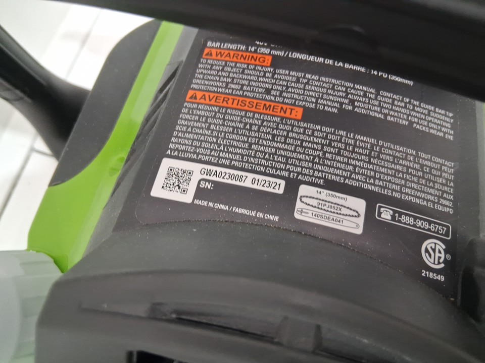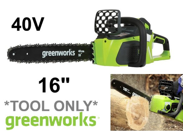 GREENWORKS 40V CORDLESS CHAINSAW - 16" - *TOOL ONLY* - green/black (MODEL: 20000800/CSF401)