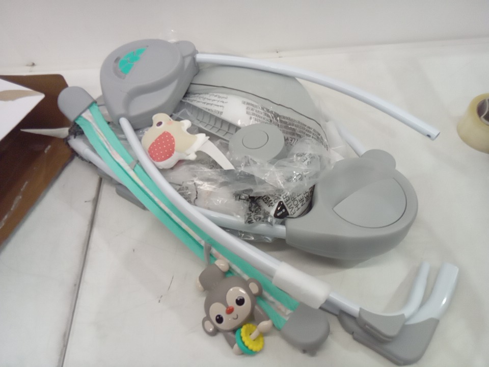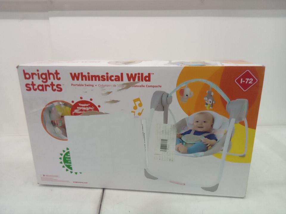 BRIGHT STARTS WHIMSICAL WILD PORTABLE COMPACT AUTOMATIC SWING WITH 10 MELODIES AND ADJUSTABLE HARNESS - MAX 20LBS - WHITE SAFARI ANIMALS (MODEL: 11803-mees)