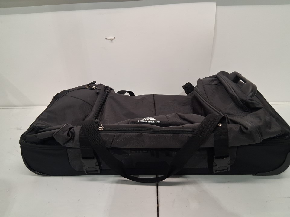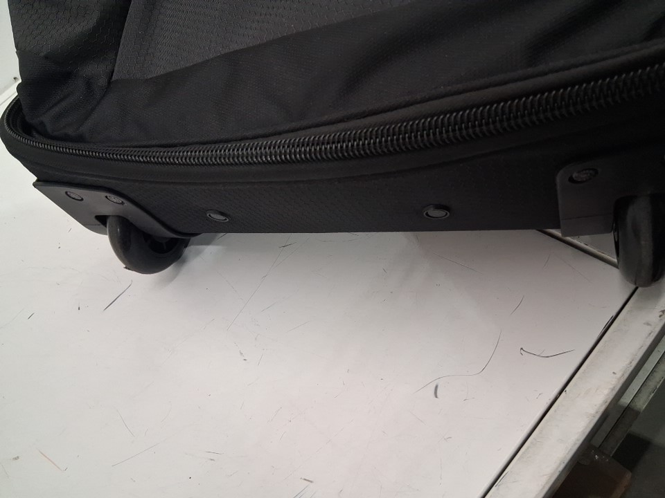 Wheels have visible dirt discoloration and there is a small tear/hole near handle