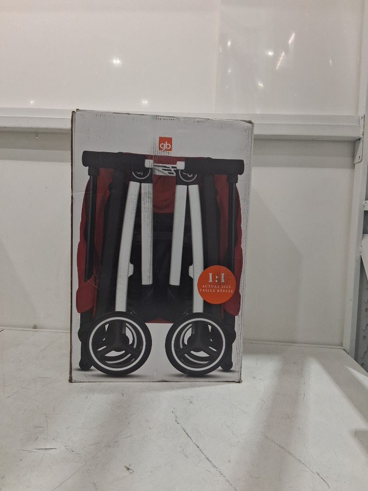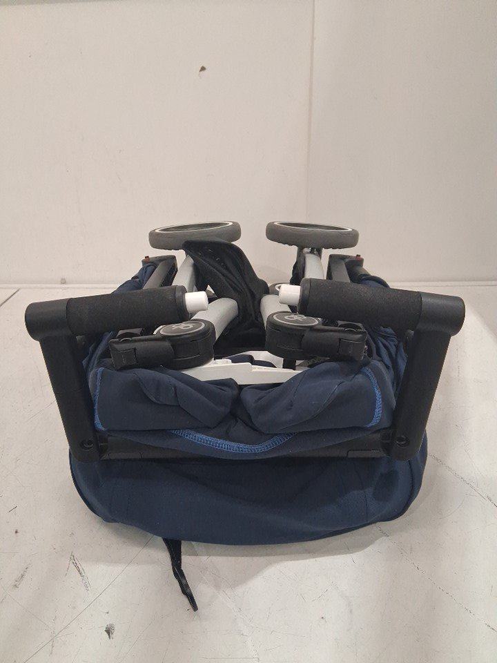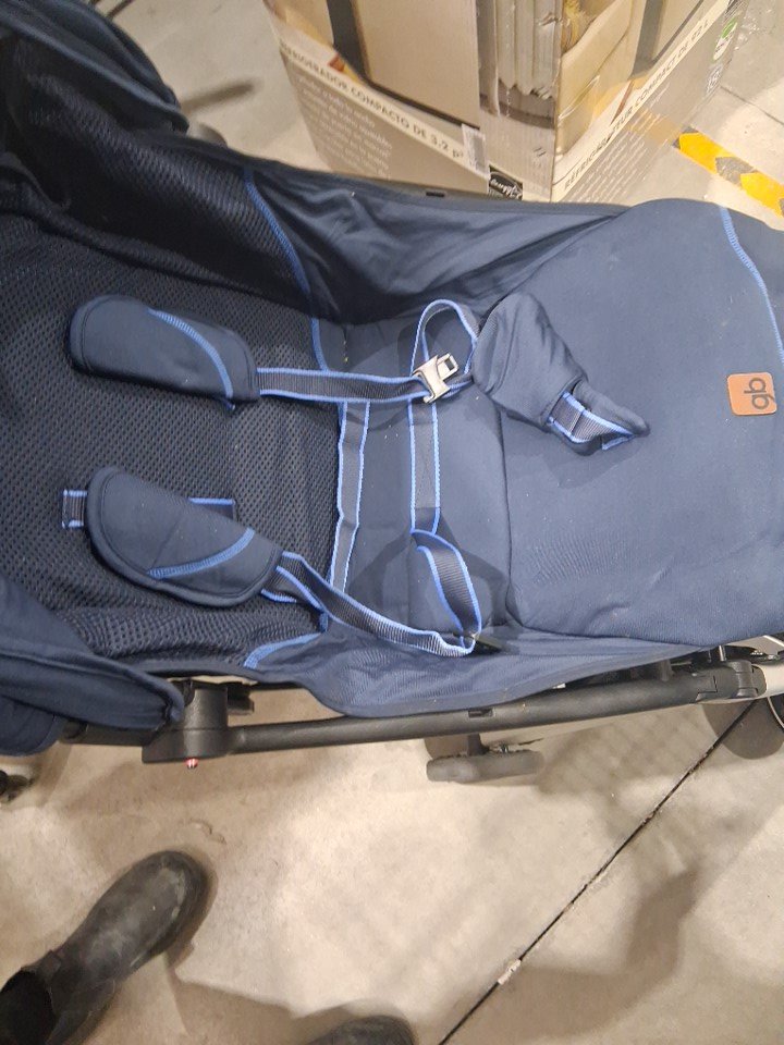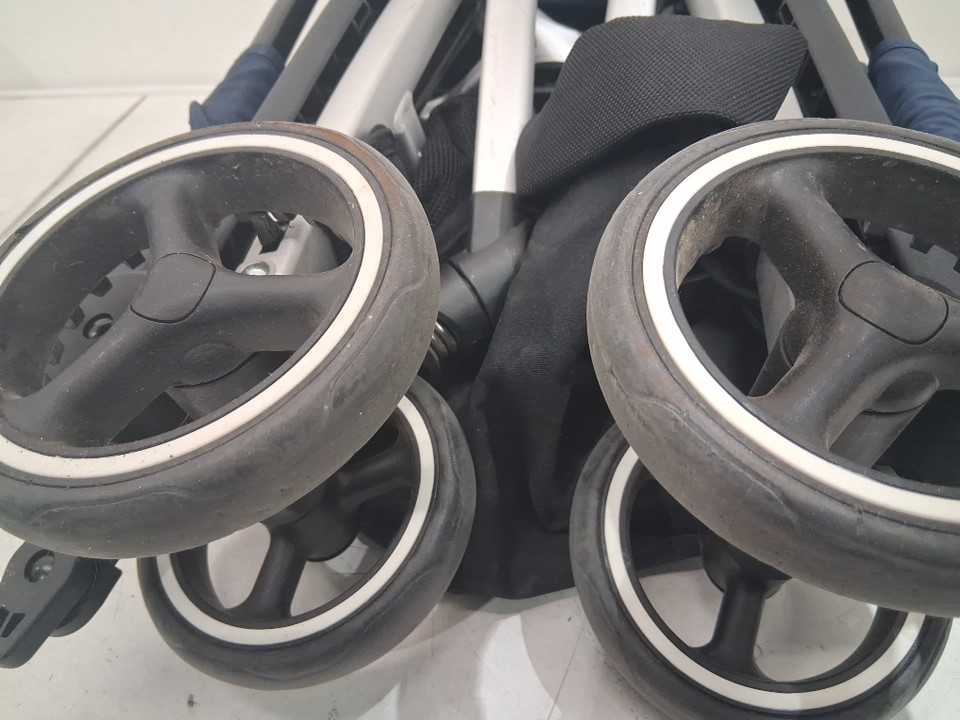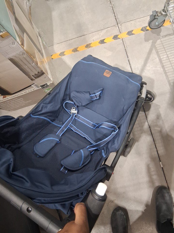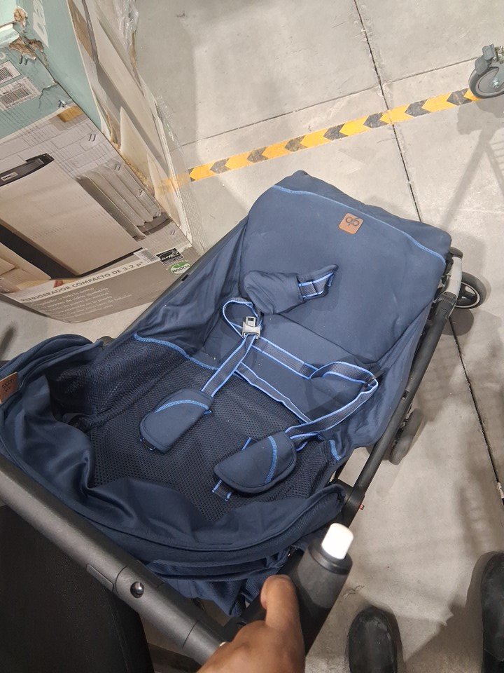 The item has a few crumbs and bits of debris, some stains on the seat, and visible wear on the tires from prior use.