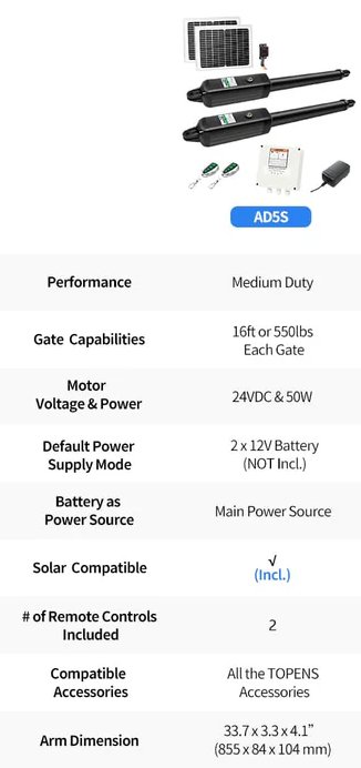 TOPENS solar dual swing gate opener WITH universal keypad - 50w - works for various swing gates (model: AD5S)