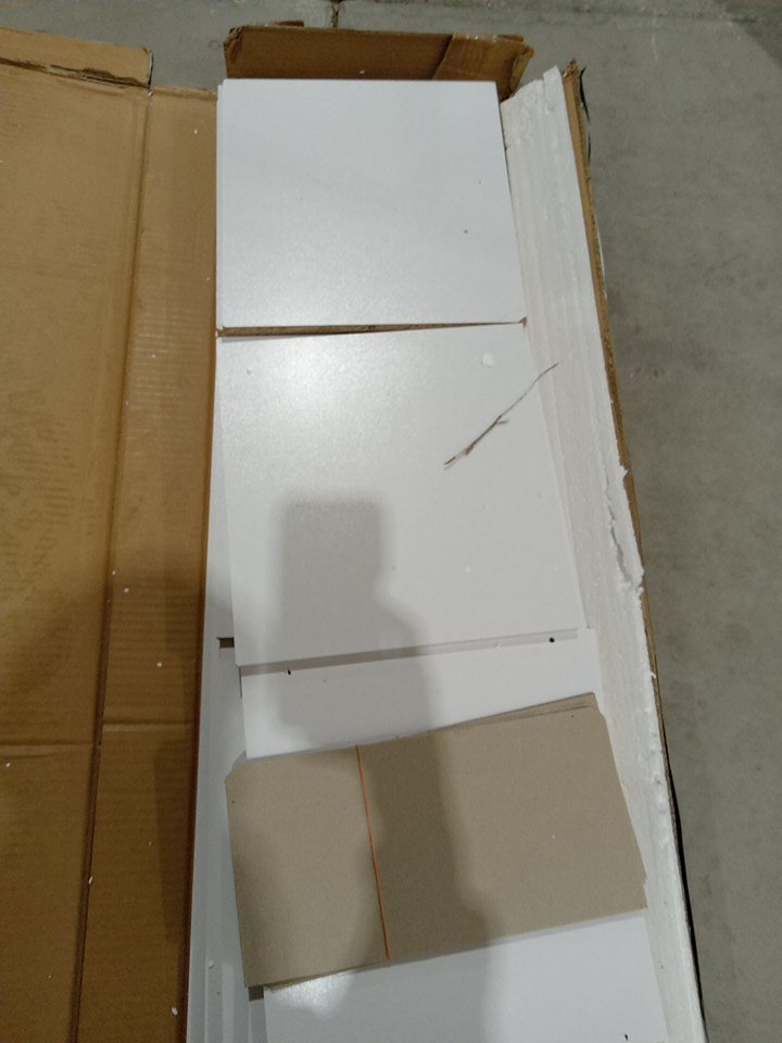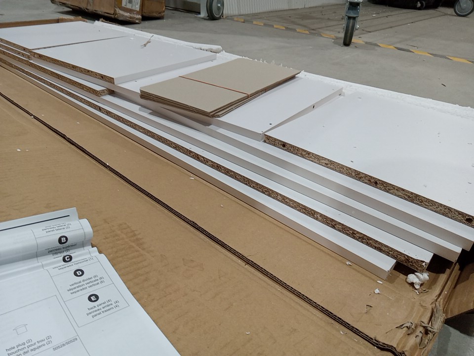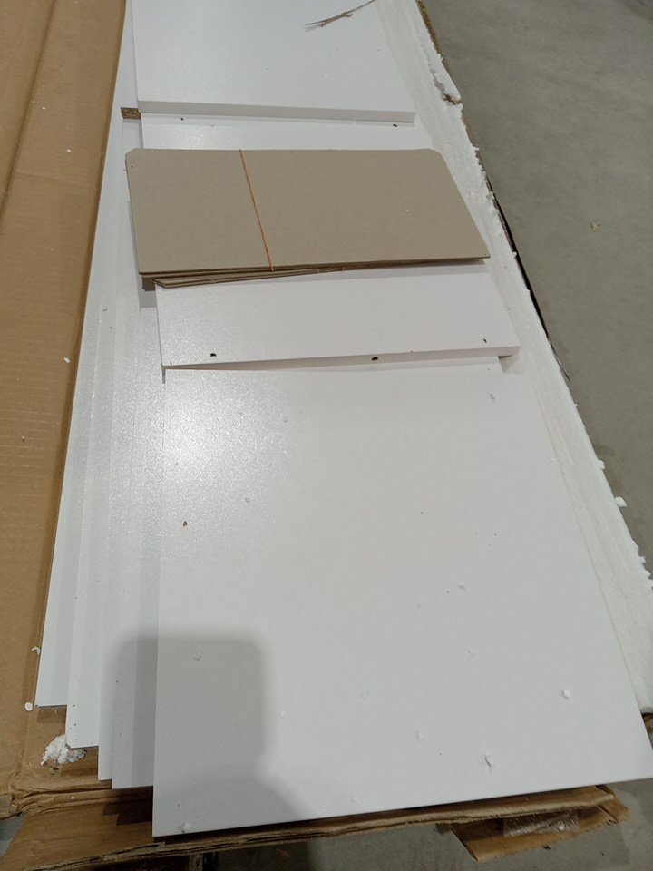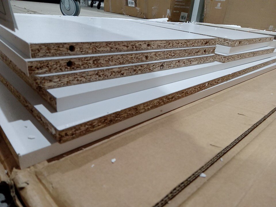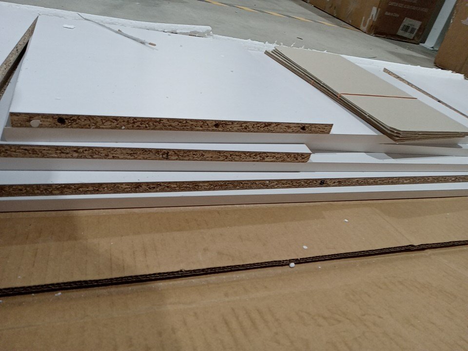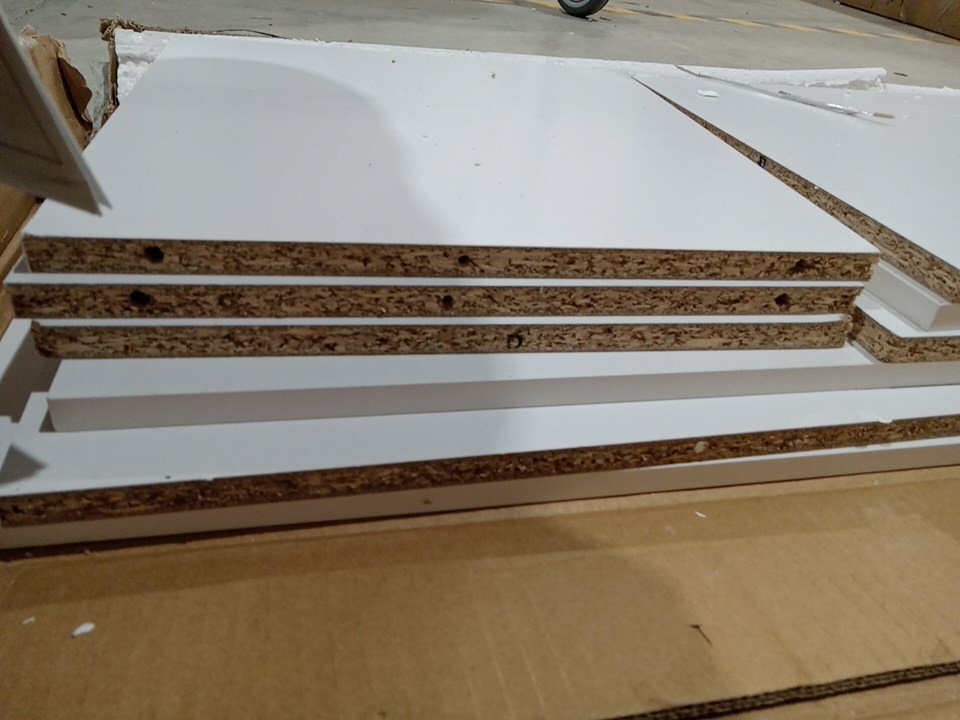 There may be some minor scuffs/scratches/edge chips on some of the wood pieces as a result from shipping. Item is missing all the hardware which customer will require in order to build/assemble item.