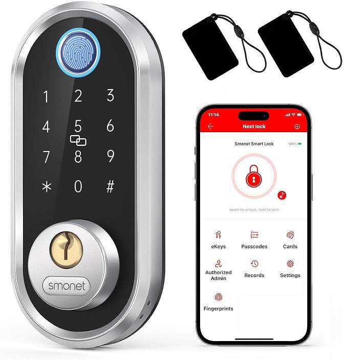 Smonet Smart Deadbolt with Fingerprint Reader, 2 Keyfobs, App Control, and Keypad - Silver (Model: Y1-SBF-S)