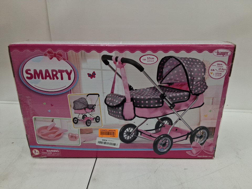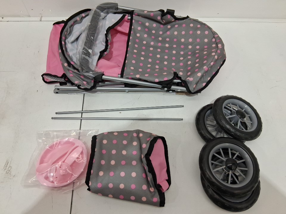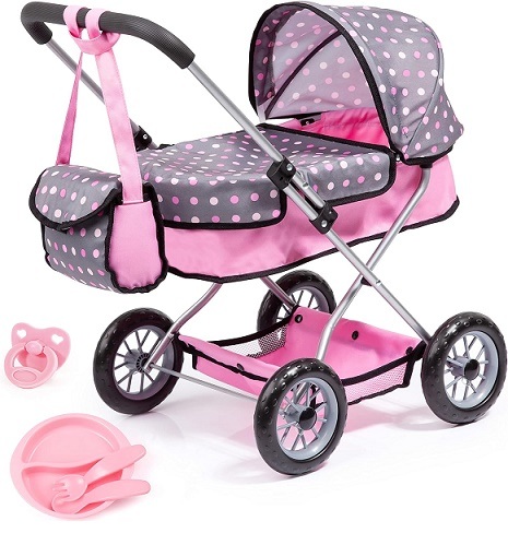 bayer smarty Doll pram Stroller Toy - for dolls up to 18" - 23" x 15" x 22" - pink/grey dots
