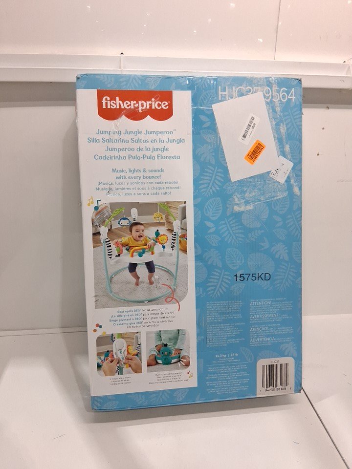 Fisher-Price Jumperoo Interactive Bouncer Baby Activity Center with Lights Sounds and Music - Jumping Jungle/Mint Blue/Green (model: HJC37-9564)