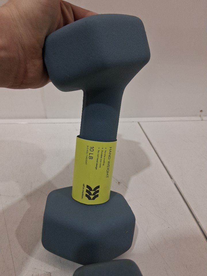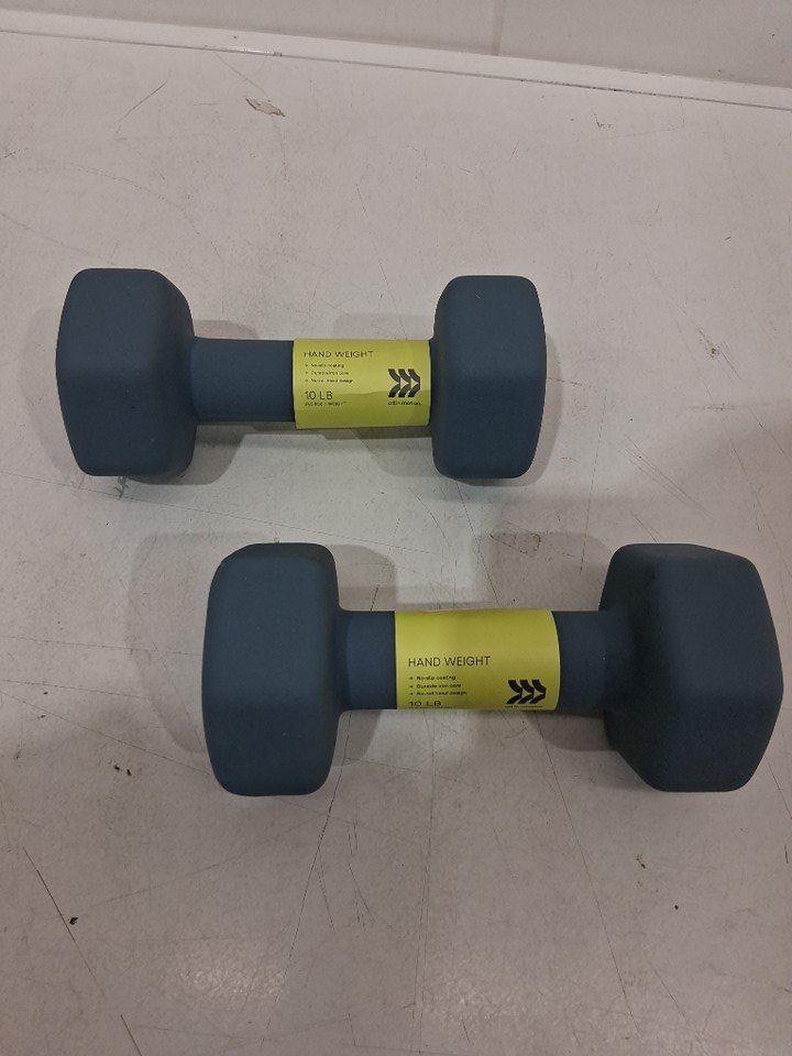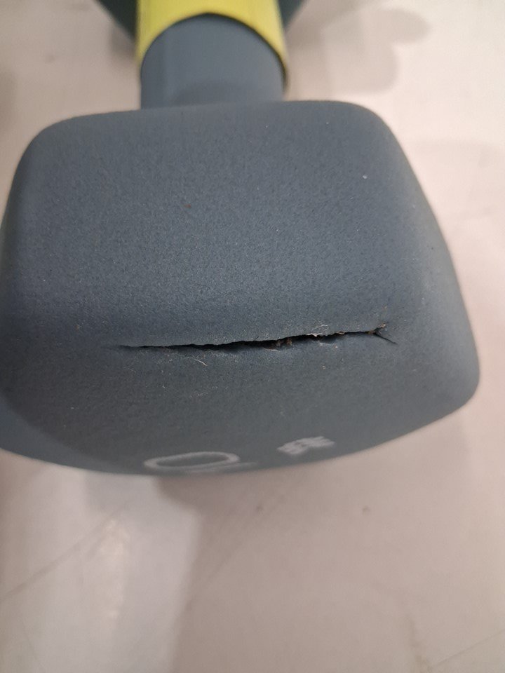 Please See Photos: - The item has tears on some surfaces presumably caused during shipping. - One of the dumbbells has damage on one side. It is broken but held together by the external material. It remains functional but has damage.