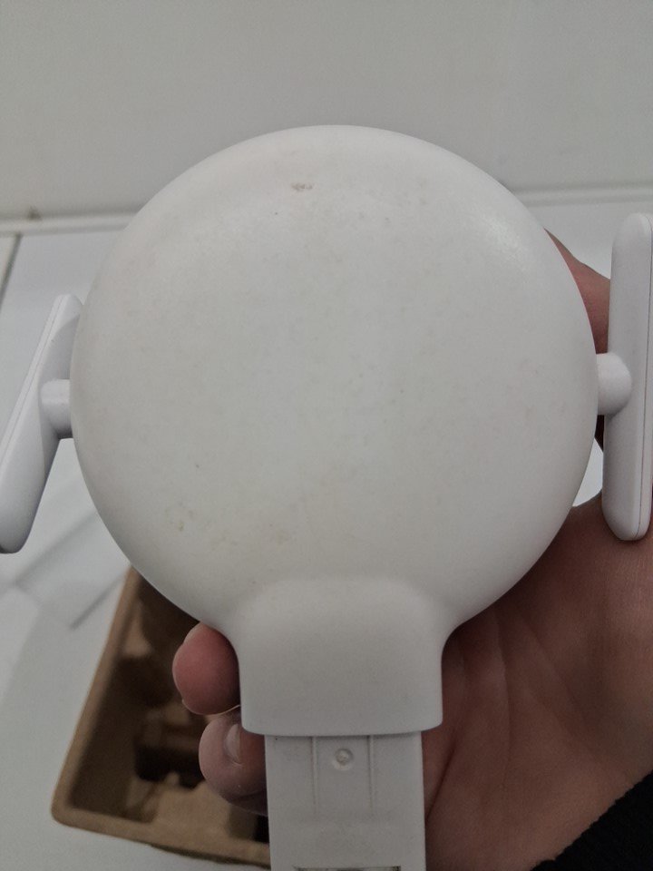 Product is Missing mounting stand and has light dirt stains along bottom and light dirt throughout product (see photos) Tested for power