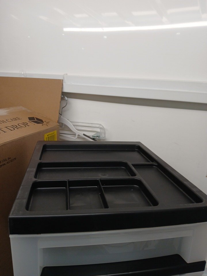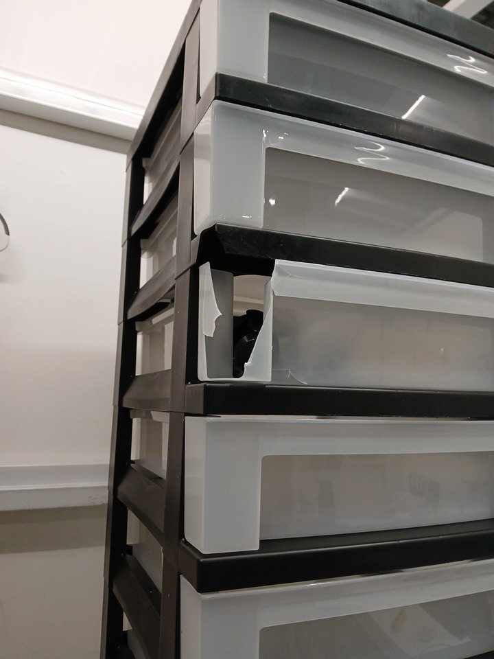 One of the drawers is cracked on the corner and edge of the frame.