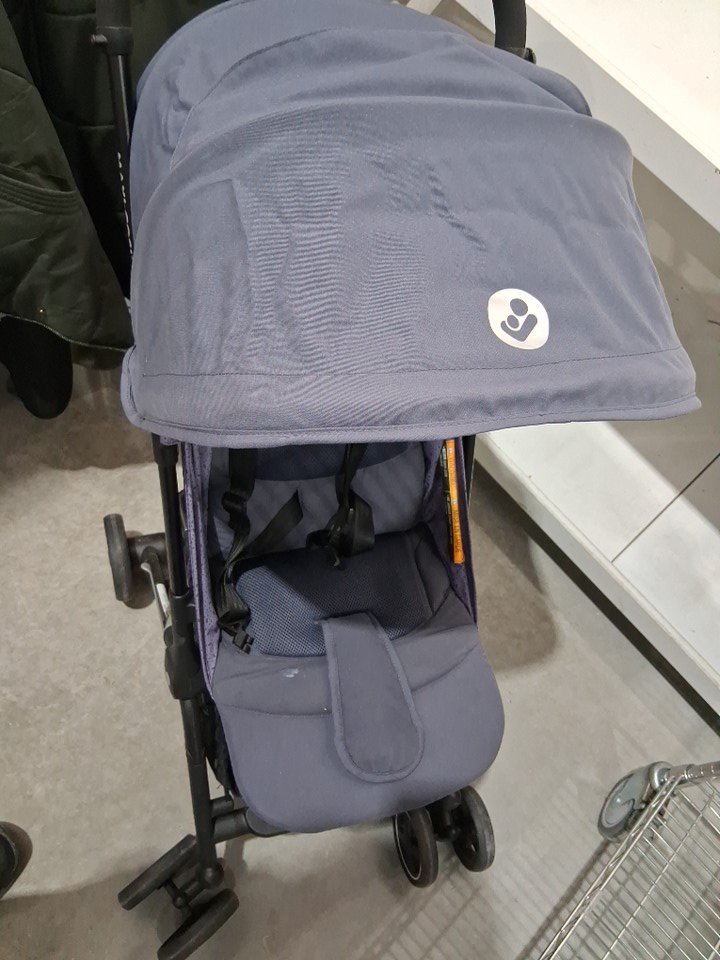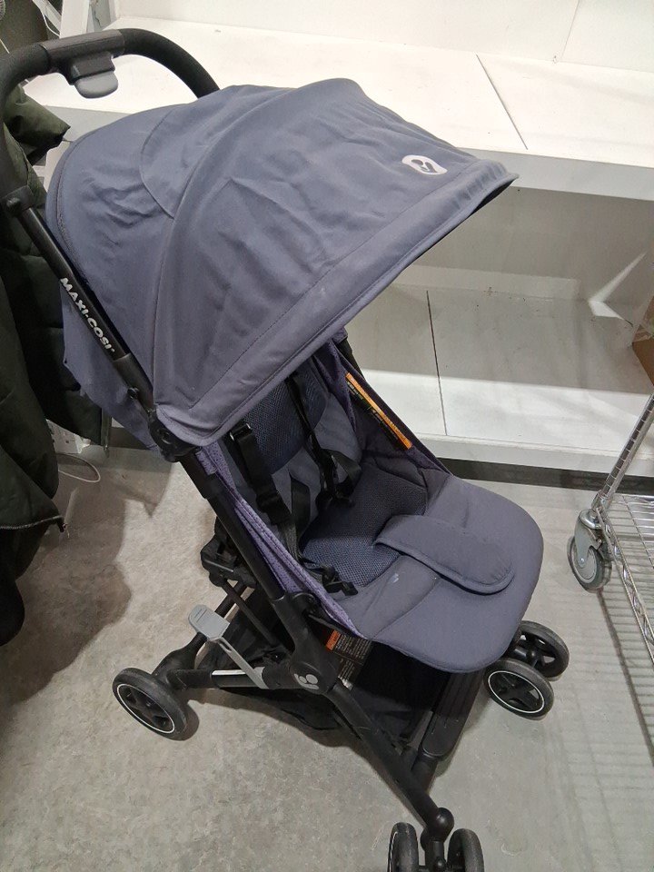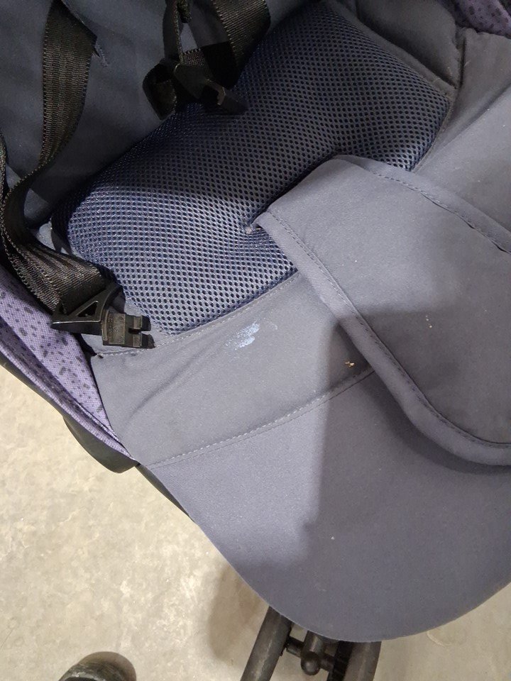there is dirt on the wheels as well as some marks on the fabric from previous use.