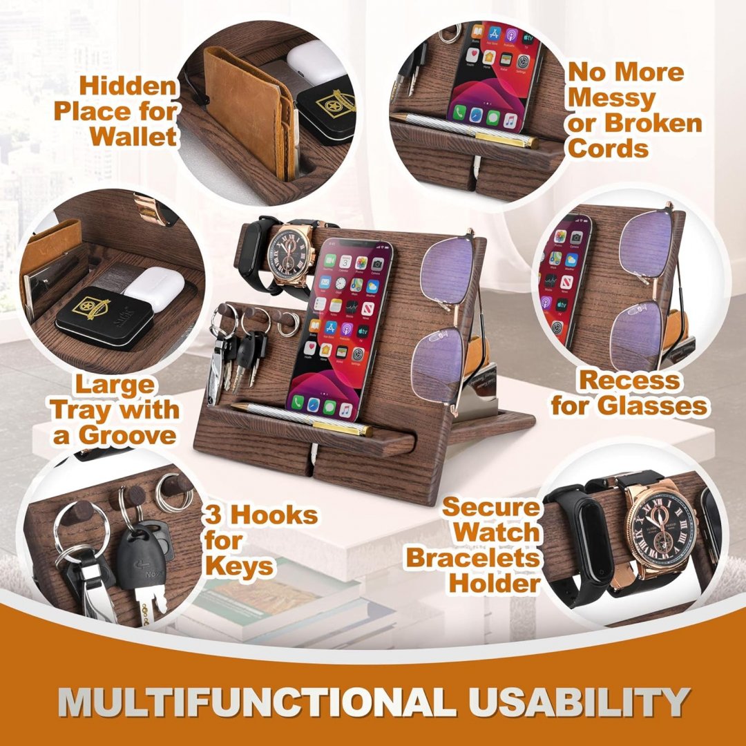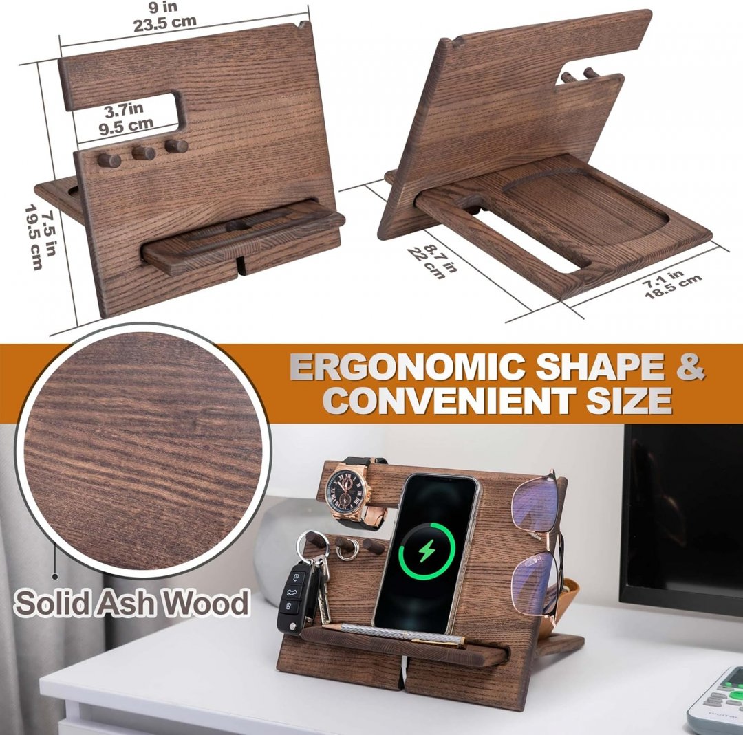 teslyar wooden phone docking station organizer with key hooks & watch holder - ash wood