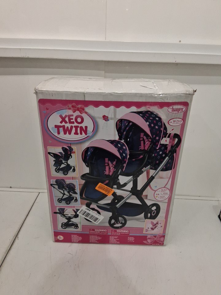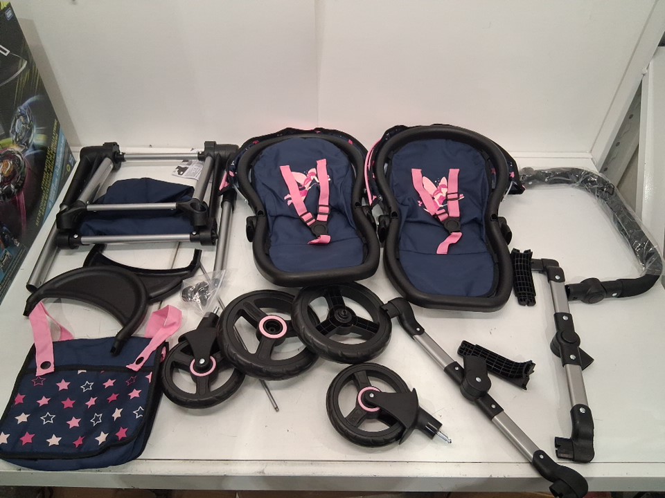 Bayer Design - twin Dolls Pram Xeo - ADJUSTABLE HANDLE Baby Stroller for Dolls with childrens side Bag - navy/pink - (MODEL: 26716aa)