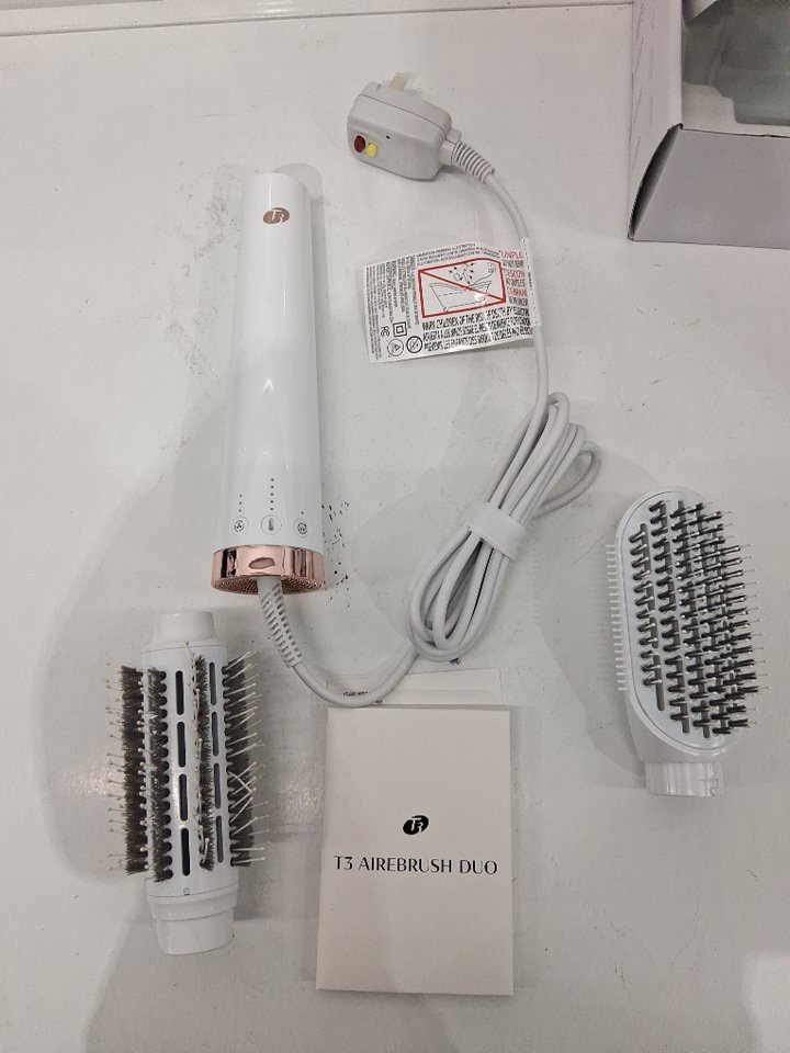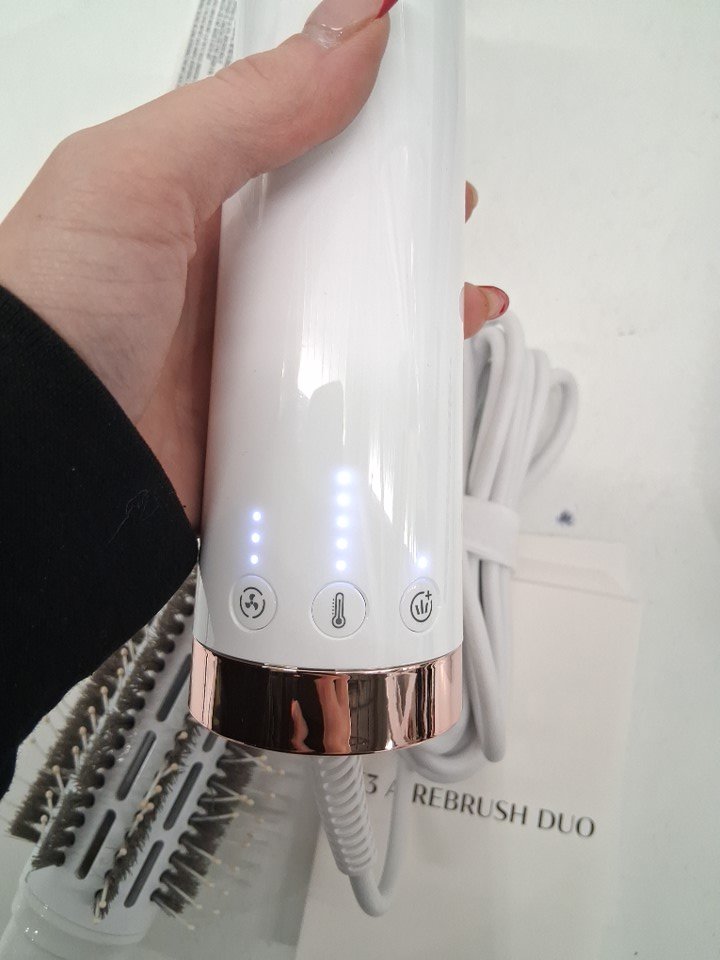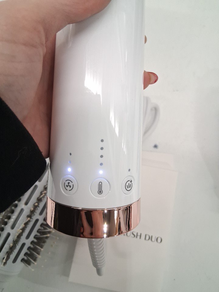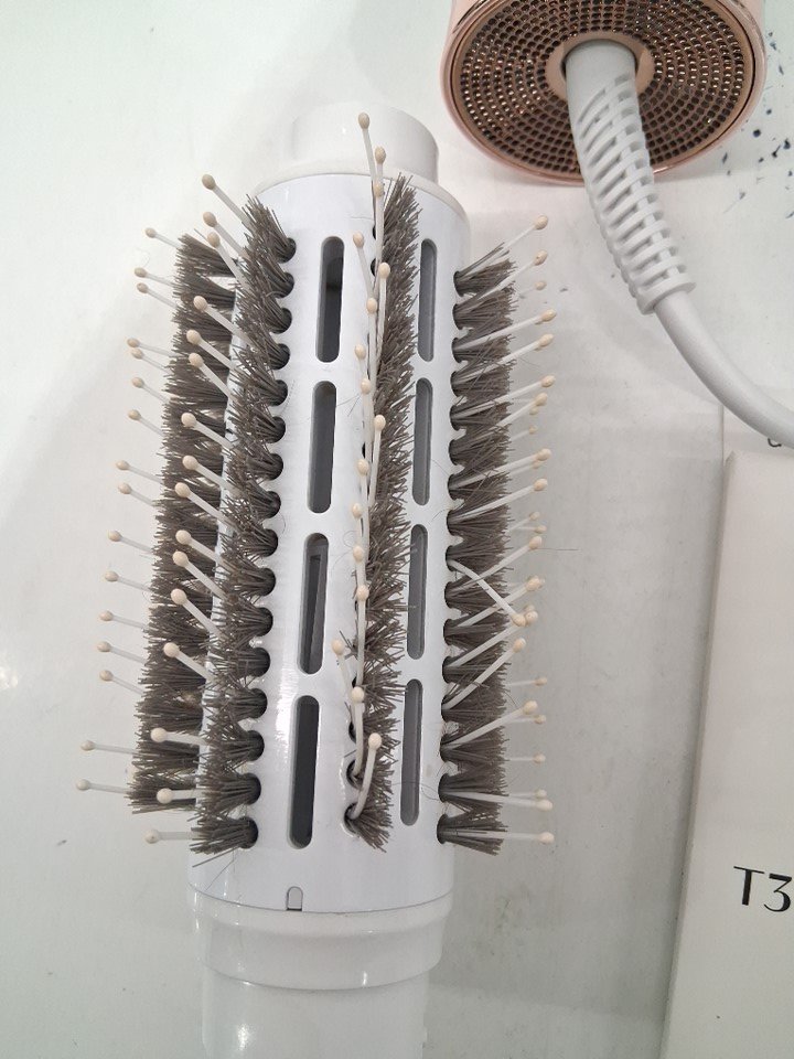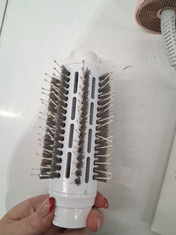The round brush attachment shows signs of prior use on the bristles as well as some debris inside the unit. See photos
