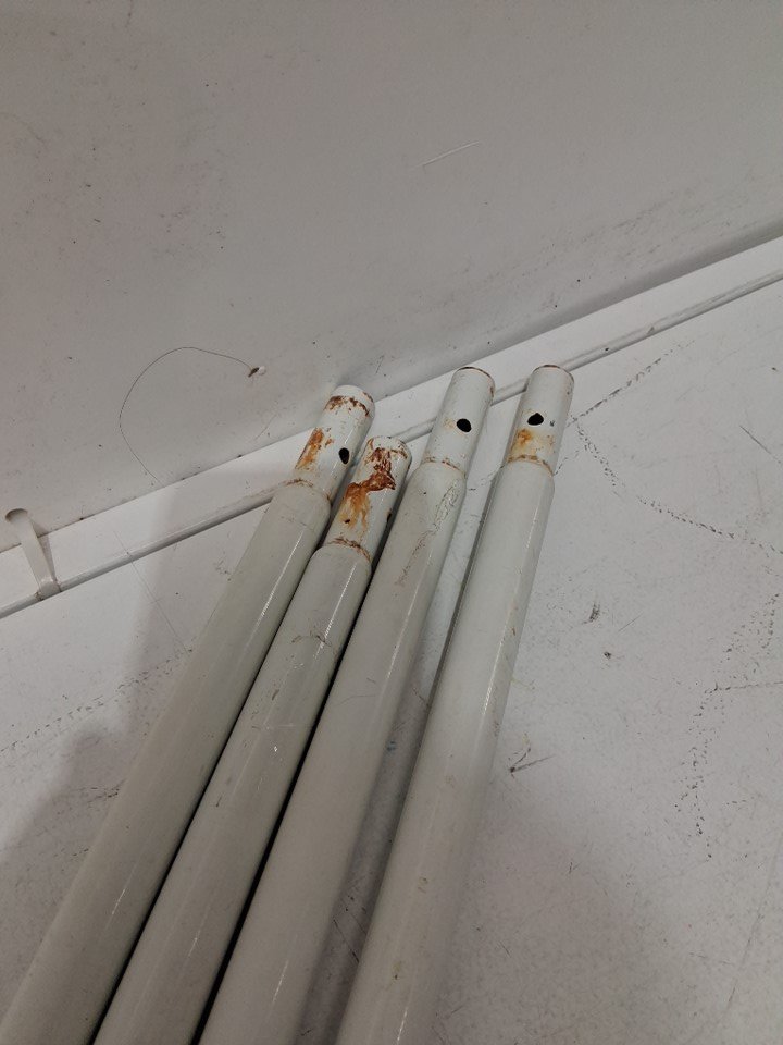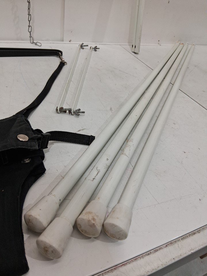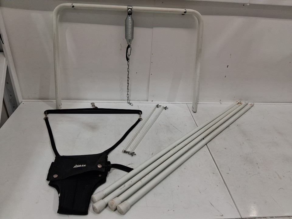 item has marks from previous assembly and the spring/chain are already assembled, there is light wear on the harness and the beginnings of rust on the metal parts. should be able to DIY paint/repair/clean to be like new