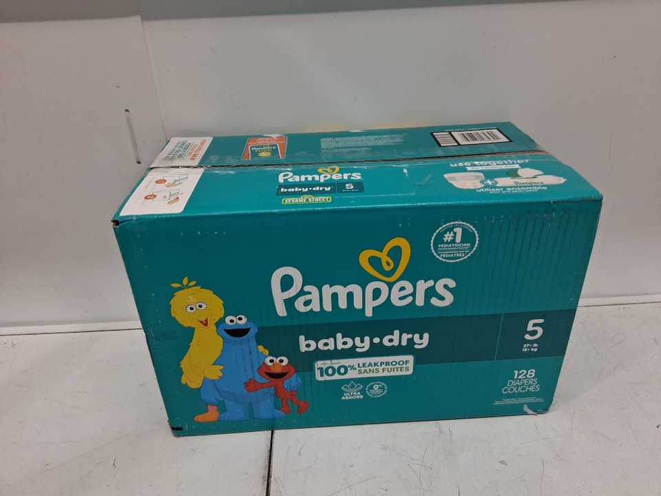128PK PAMPERS BABY-DRY DISPOSABLE DIAPERS - SIZE 5 - 27+ LBS - SESAME STREET