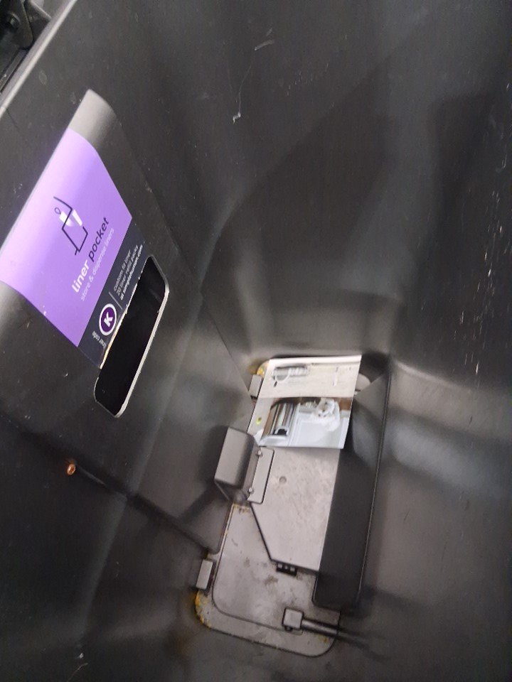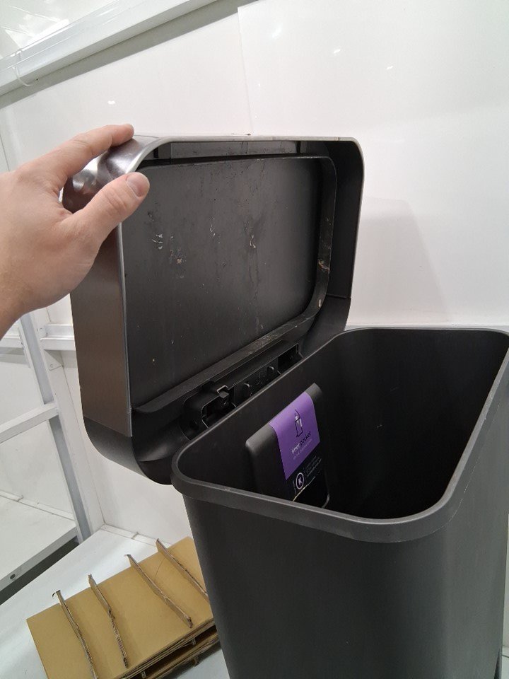 product has an odor of coffee and multiple staining throughout the product inside and out and on the lid as well.