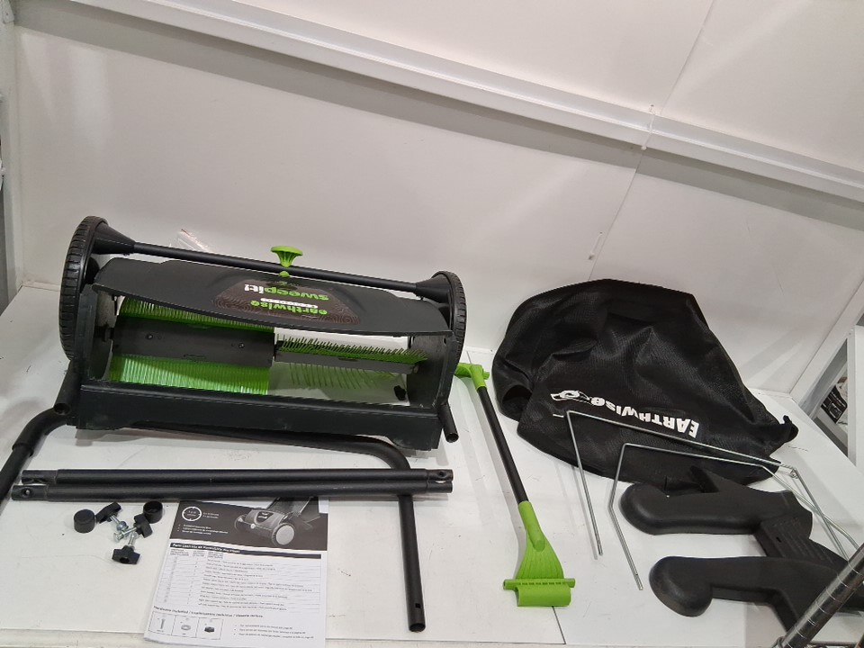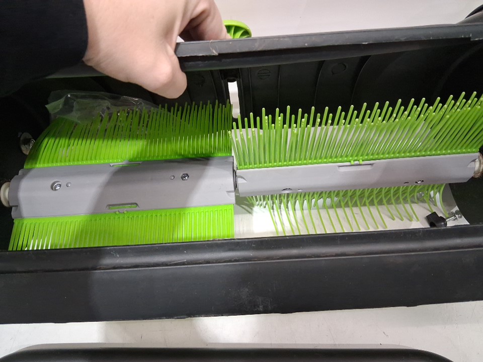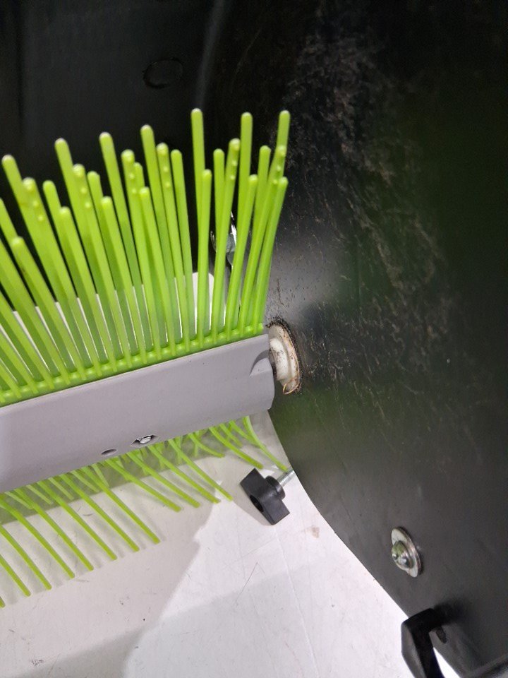 there is dirt on the entirety of the sweeper, there i some rust on the inner turning axle, as well as some of the bristles are bent.